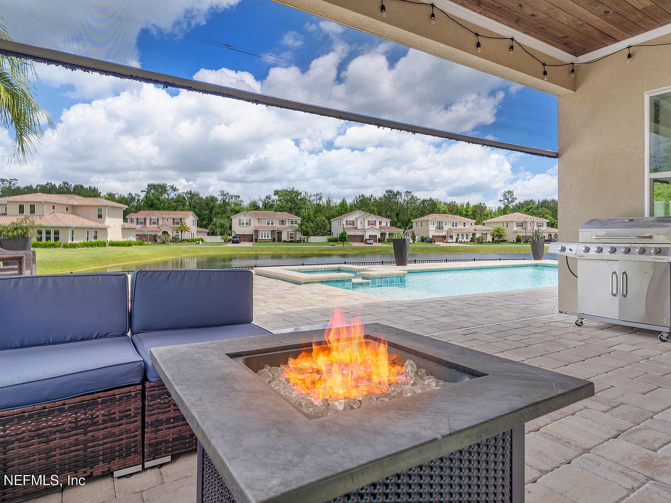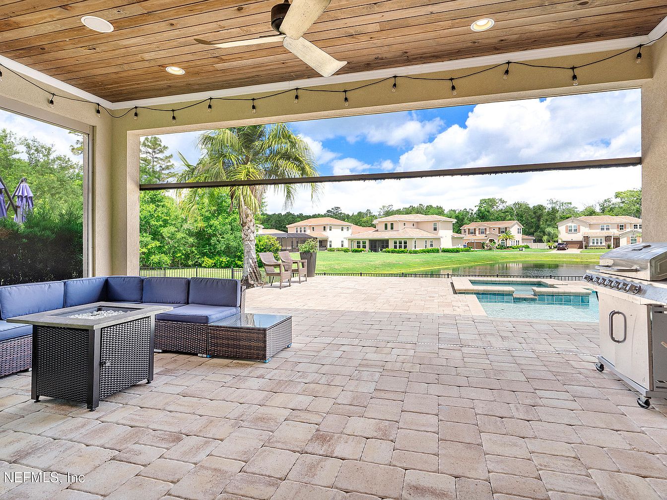 This spacious covered patio features a cozy fire pit with glowing flames surrounded by comfortable navy-blue cushioned wicker seating. The flooring is composed of light-toned pavers that extend seamlessly to the outdoor pool area, creating a cohesive flow. Above, a wooden ceiling with stylish string lights adds warmth and charm under the shelter. To the right, a sleek stainless steel barbecue grill suggests an inviting space for outdoor cooking and entertaining. The view opens to a large swimming pool with an adjacent hot tub, backed by a lush green lawn and neighboring homes, offering a serene suburban setting.
