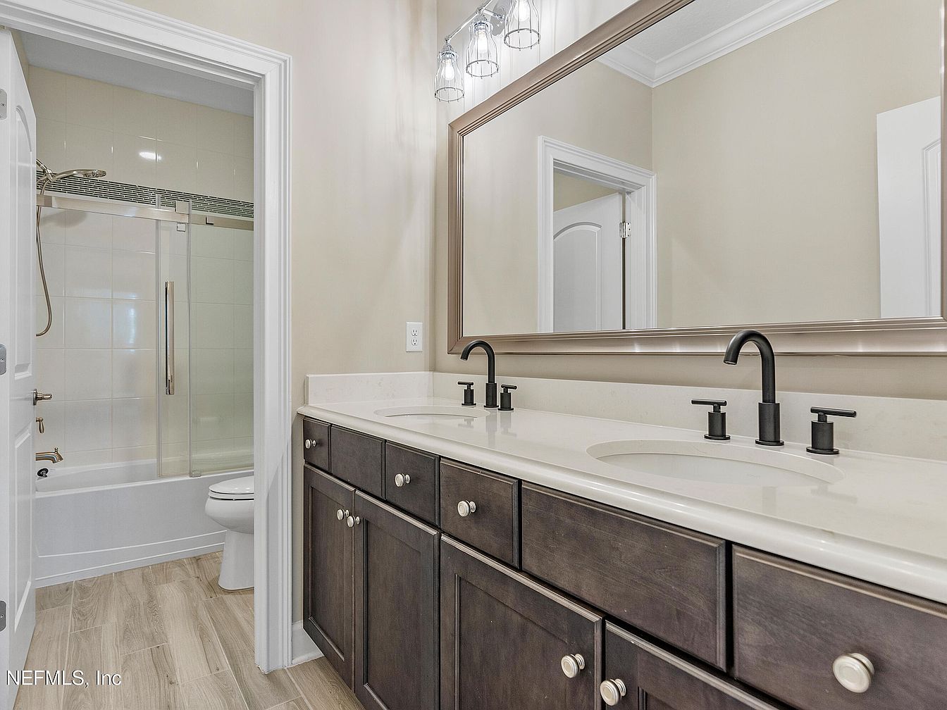 This bathroom features a spacious double-sink vanity with a sleek white countertop contrasted by rich, dark wood cabinetry. Matte black fixtures, including modern faucets and soap dispensers, add a contemporary edge to the design. Above the vanity, a large framed mirror stretches across the wall, reflecting soft lighting from a ceiling fixture with exposed bulbs encased in wire cages. The light beige walls and wood-look flooring create a warm and inviting atmosphere. In the background, a tub/shower combo with a sliding glass door and a decorative tile accent strip brings subtle texture and pattern to the overall clean and polished aesthetic.