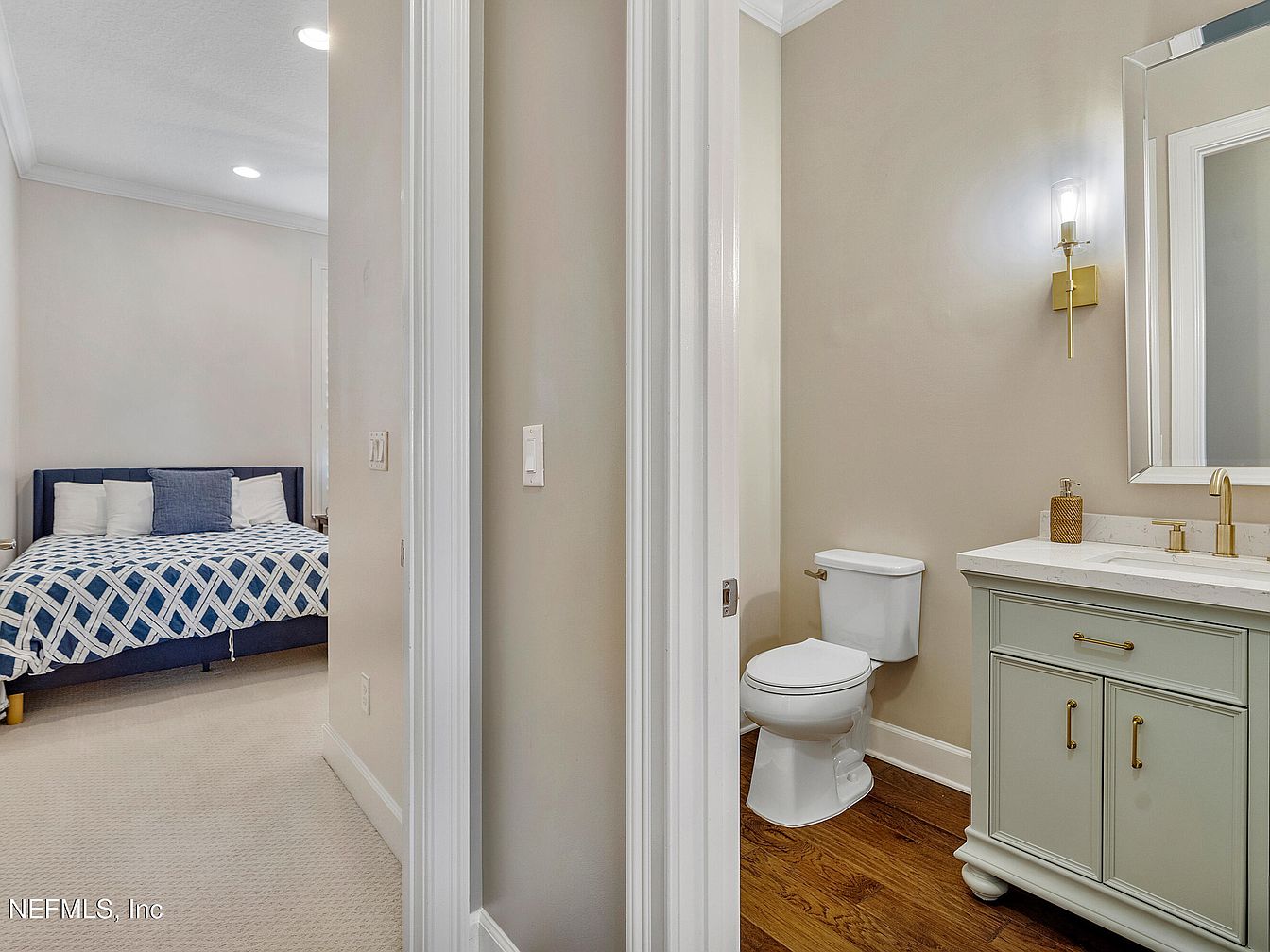 This transitional space reveals a glimpse into a cozy bedroom and a small, stylish bathroom. The bedroom features a plush bed adorned with a blue and white geometric patterned comforter, complementing the dark upholstered headboard. Neutral beige walls enhance the calming atmosphere, while the soft carpet underfoot adds comfort. Adjacent, the bathroom combines warm wood flooring with a soft beige wall tone. A light gray vanity with brass hardware supports a white marble countertop and modern gold faucet, paired with a rectangular mirror and a sleek wall sconce, blending classic charm with contemporary touches.