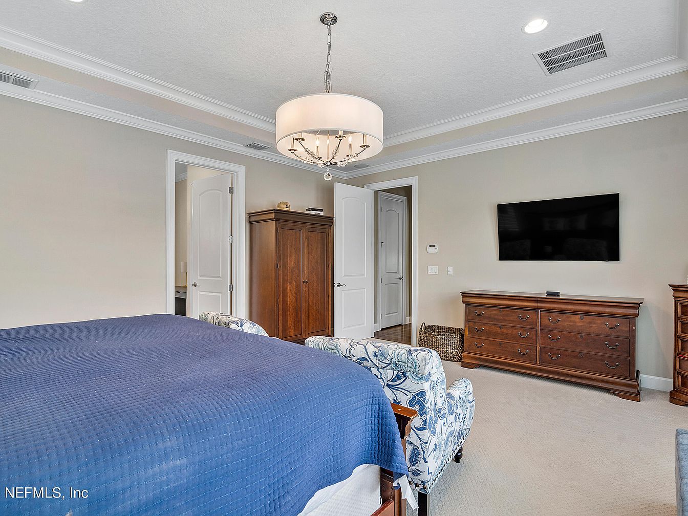 This master bedroom features a refined seating area at the foot of the bed, with two upholstered armchairs showcasing a classic blue and white floral pattern that complements the deep blue quilted bedspread. The room is painted in a soft beige tone which contrasts gracefully with the rich, dark wood furniture pieces including a tall armoire and a long dresser beneath a mounted flat-screen TV. The ceiling boasts elegant crown molding and a cylindrical drum chandelier with crystal accents, providing a blend of traditional sophistication and modern comfort. The layout is open and inviting, with crisp white doors leading to adjoining spaces.