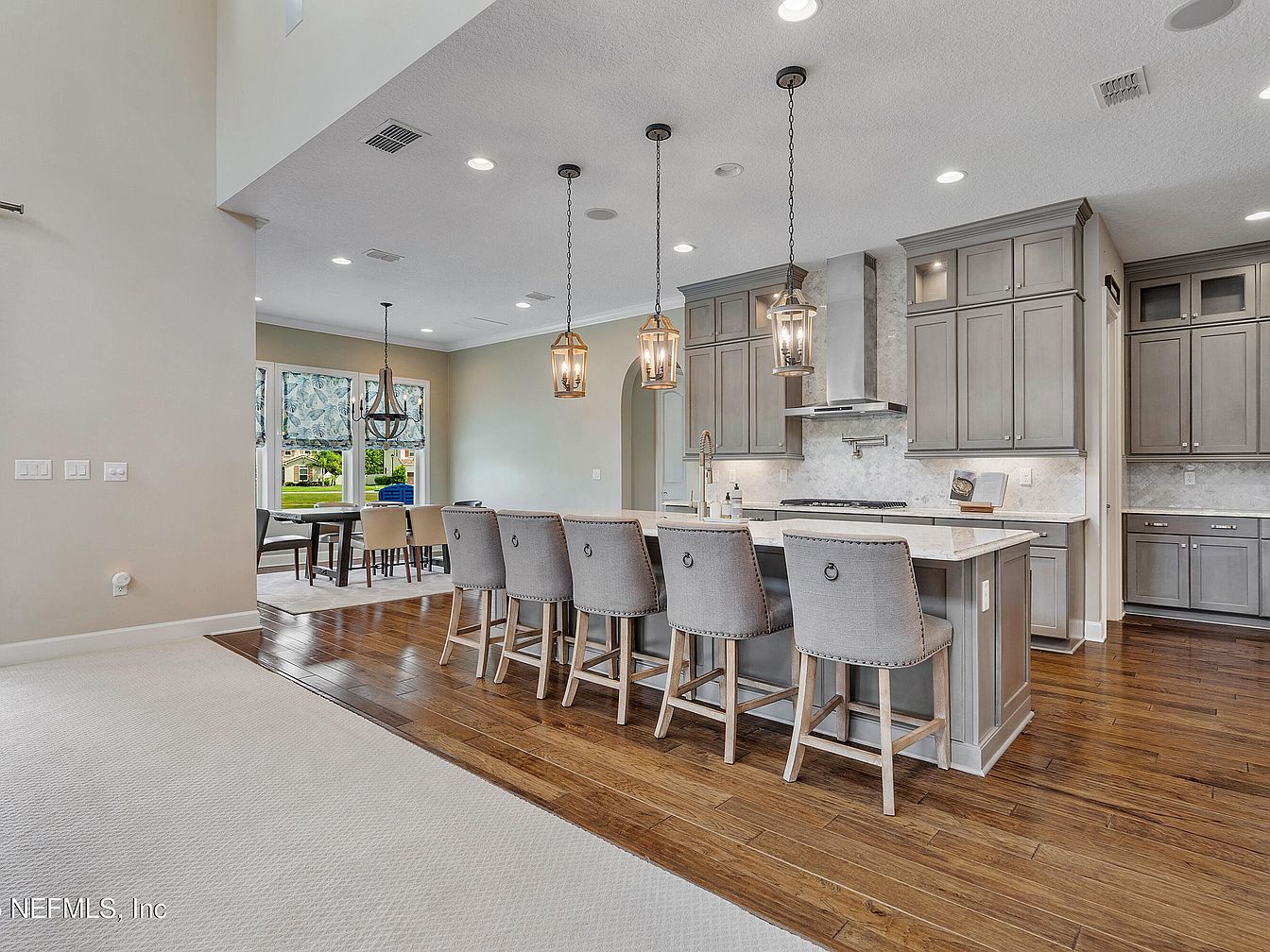 This open-concept kitchen features a spacious island with six upholstered bar stools, ideal for casual dining or entertaining. The cabinetry is a soft gray tone, complemented by marble countertops and backsplash, adding elegance and modernity. Three pendant lantern lights hang over the island, providing warm ambient lighting. The kitchen is connected seamlessly to a cozy dining nook, accented by large windows with patterned Roman shades, allowing natural light to brighten the space. The flooring combines rich wood in the kitchen and dining area with plush carpet transitioning to the adjoining room, creating a welcoming, sophisticated atmosphere.