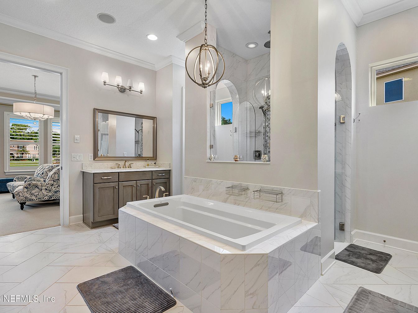 This spacious master bathroom features a sophisticated design with a large, marble-tiled soaking tub at the center, surrounded by a wrapped marble base. Adjacent is an elegant walk-in shower with a glass door and arched tile details, enhancing the softness of the space. The vanity is finished in a warm wood tone with a marble countertop and large mirror, complemented by modern wall-mounted lighting. Neutral tones dominate, with soft whites and muted greys creating a calm atmosphere. A decorative chandelier above the tub adds a touch of luxury, all balanced by plush grey bath mats. Through an open doorway, a cozy seating room with floral upholstery and abundant natural light is visible, connecting comfort seamlessly to the bathroom.