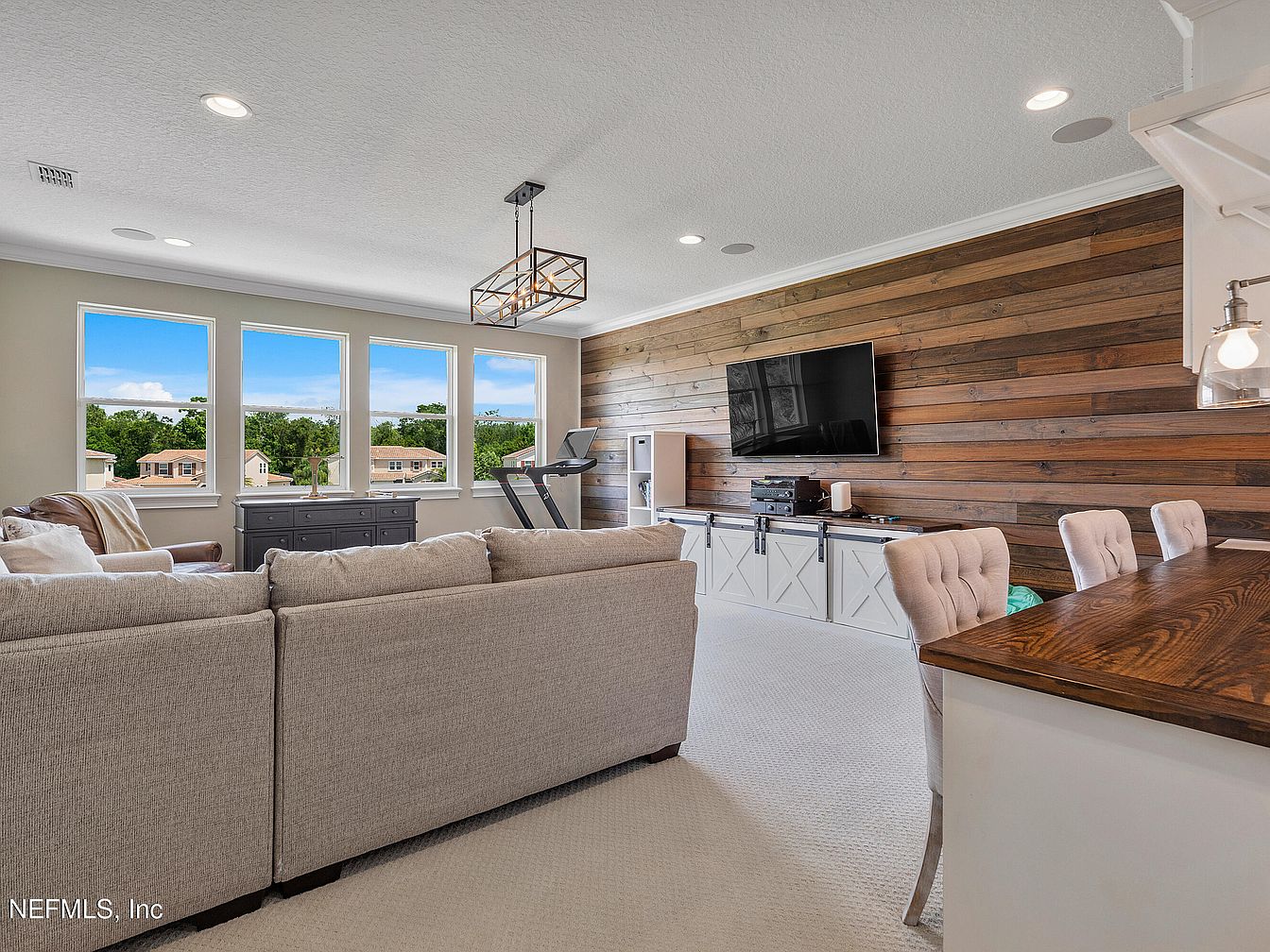 This bright and inviting family room features a large beige sectional sofa facing a modern entertainment wall with a rich wooden plank backdrop. The wall-mounted flat-screen TV and white barn-style cabinetry below provide a rustic yet contemporary focal point. A set of four large windows on one side allows natural light to fill the space and offers a view of the neighborhood greenery. The room also includes a treadmill tucked near the windows, blending comfort and practicality. The lighting fixture above the seating area is geometric and stylish, complementing the warm wood and neutral tones. Adjacent to the space is a dark wood countertop with tufted beige chairs, connecting this area into an open-plan layout.