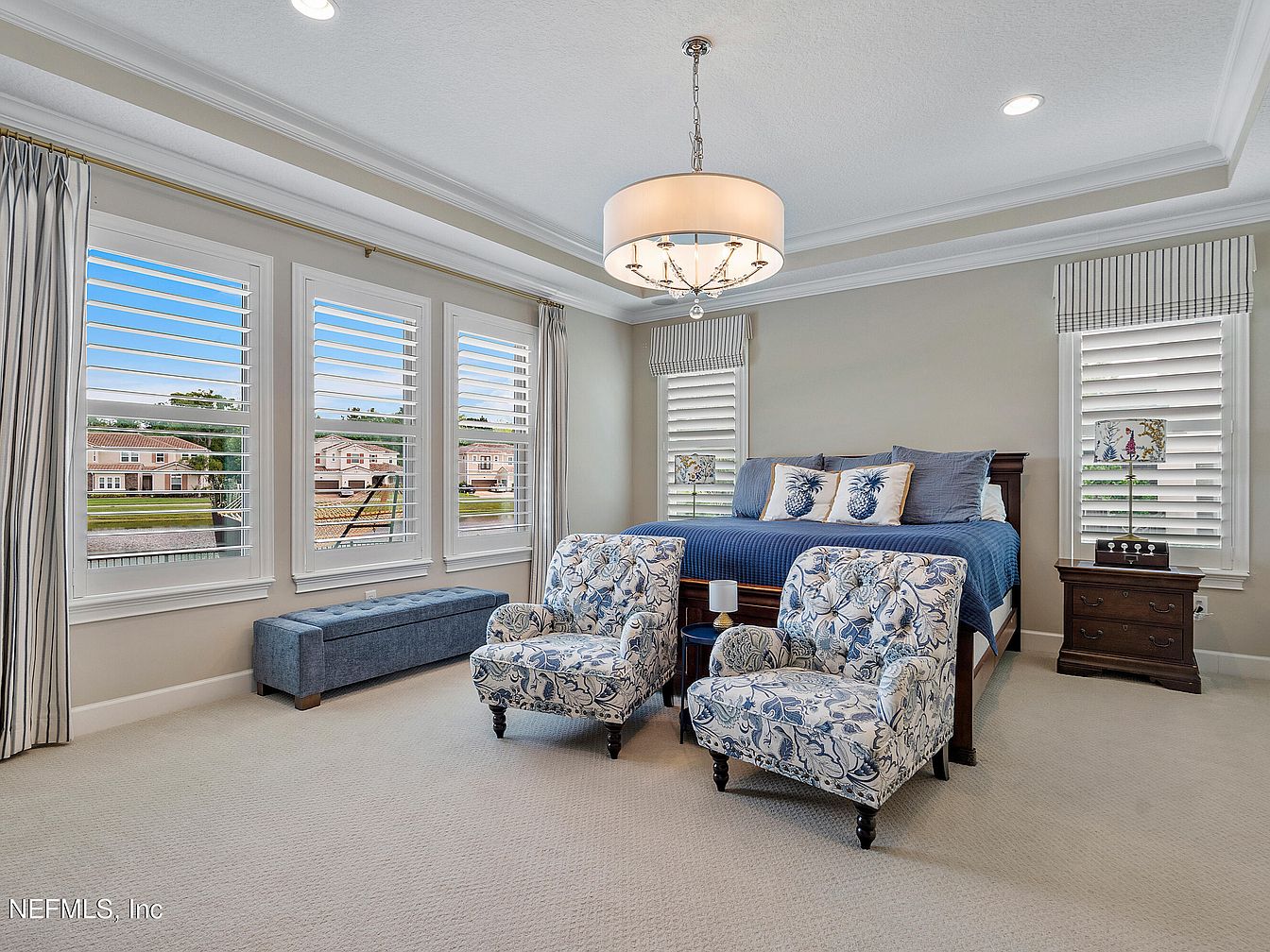 This master bedroom features a spacious layout with a neutral beige carpet and soft gray walls, complemented by white trim and crown molding. The room is illuminated by natural light streaming through four white plantation shutters on large windows, offering views of neighboring houses. Two patterned armchairs with blue and beige floral upholstery create a cozy seating area at the foot of a dark wood bed dressed in blue bedding and decorative pineapple pillows. Matching wooden nightstands flank the bed, each topped with a unique lampshade. A modern round chandelier hangs from a tray ceiling, adding elegance to the space.
