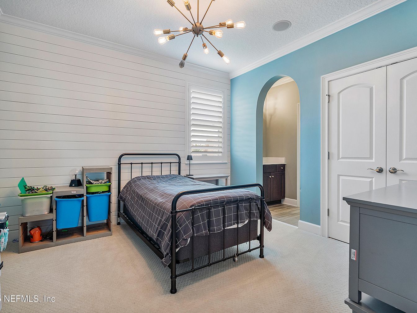 This cozy bedroom features a sleek black metal bedframe with a dark gray checkered bedding set that anchors the space. The walls combine calming blue and white shiplap panels, adding a touch of rustic charm alongside modern design. A standout mid-century modern chandelier with multiple exposed bulbs offers ambient lighting. A small desk sits under the window with white plantation shutters, allowing natural light to soften the room. On one side, a playful storage organizer holds colorful bins. An open arched doorway reveals a glimpse of the ensuite bathroom, enhancing flow and accessibility.