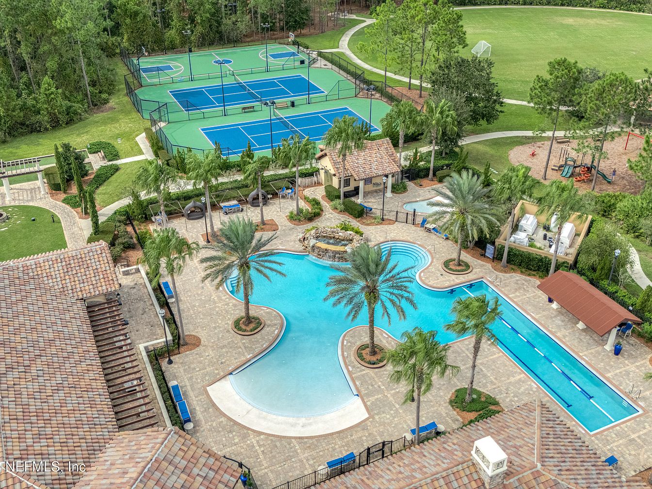 This vibrant community recreational space features a scenic pool area surrounded by palm trees, blending a resort-like atmosphere with natural greenery. The pool includes multiple sections, from a circular lazy river style zone to a long lap swimming lane, all bordered by light-colored stone pavers which contrast nicely with the blue water. Adjacent are tennis and basketball courts painted in bright blues and greens, framed by fences and benches for spectators. Well-maintained landscaping, curved walking paths, and a nearby children’s playground add to the family-friendly, inviting ambiance of this outdoor communal setting.