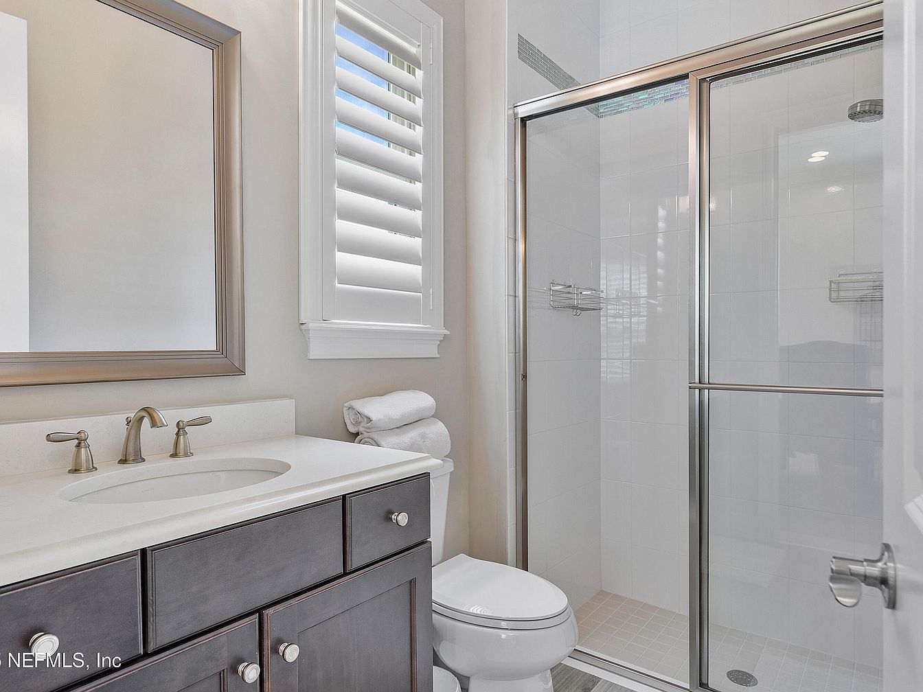 This compact bathroom combines modern and clean design elements. A dark wood vanity with silver hardware contrasts with the light, neutral color palette of the walls and countertop, featuring a white oval sink and brushed nickel faucet. Above the vanity, a framed mirror adds a touch of sophistication. To the right, a glass-enclosed shower with sliding doors features white tile and a subtle mosaic accent near the top edge. The window beside the vanity is fitted with white plantation shutters, allowing for adjustable natural light, maintaining the bright and airy ambiance of the space.