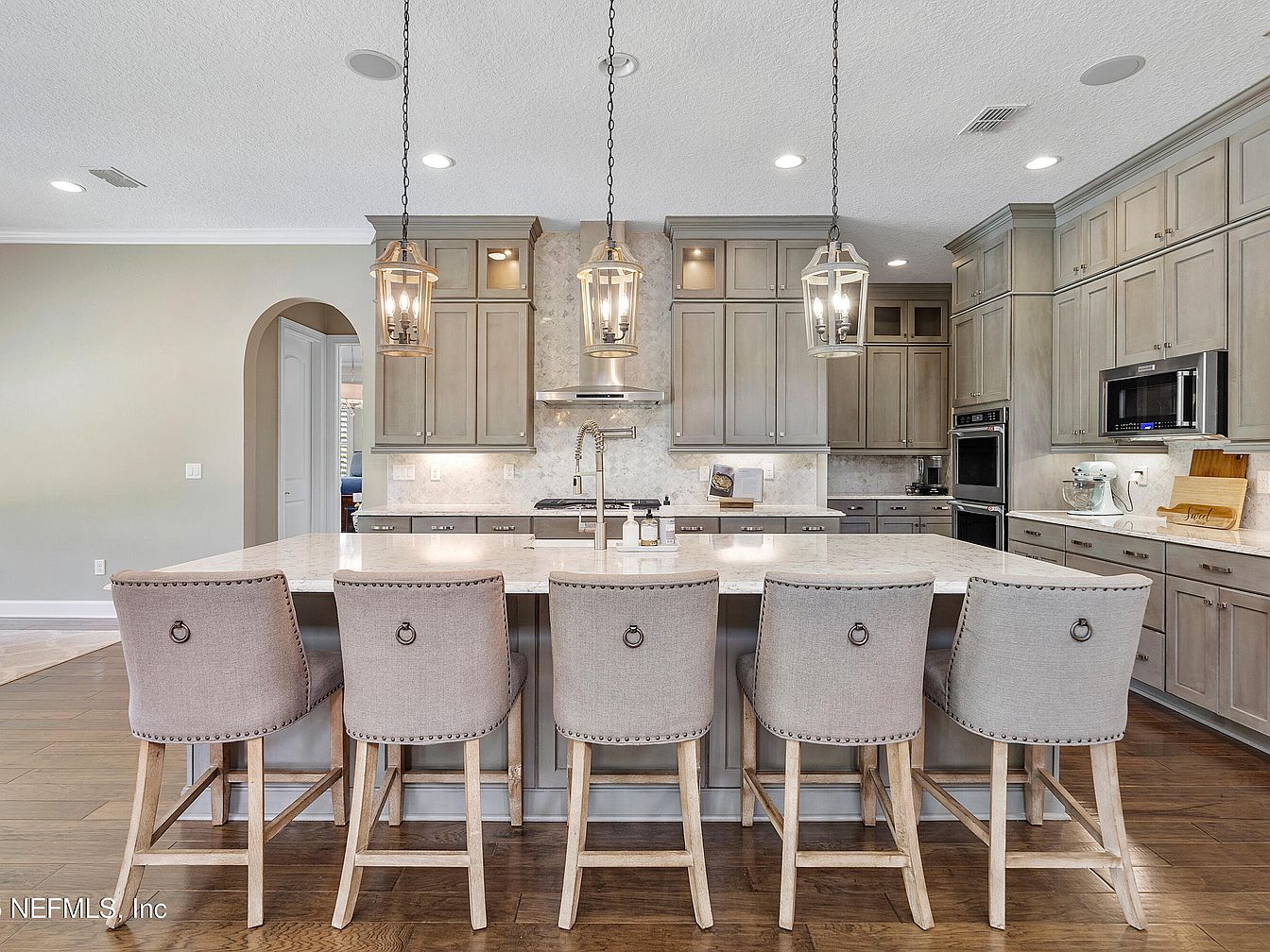 This kitchen features an expansive island with a sleek marble countertop, surrounded by six upholstered bar stools with a natural wood finish and nailhead trim. Above, three pendant lights with classic lantern-style shades provide focused illumination. The cabinetry is abundant, painted in a muted taupe-gray tone with shaker-style doors, offering generous storage and framing a stainless steel vent hood. The backsplash and countertops have a subtle, light marble pattern complementing the cabinetry’s warm undertone. The overall aesthetic balances traditional elegance with modern convenience in a clean, bright, and inviting space.