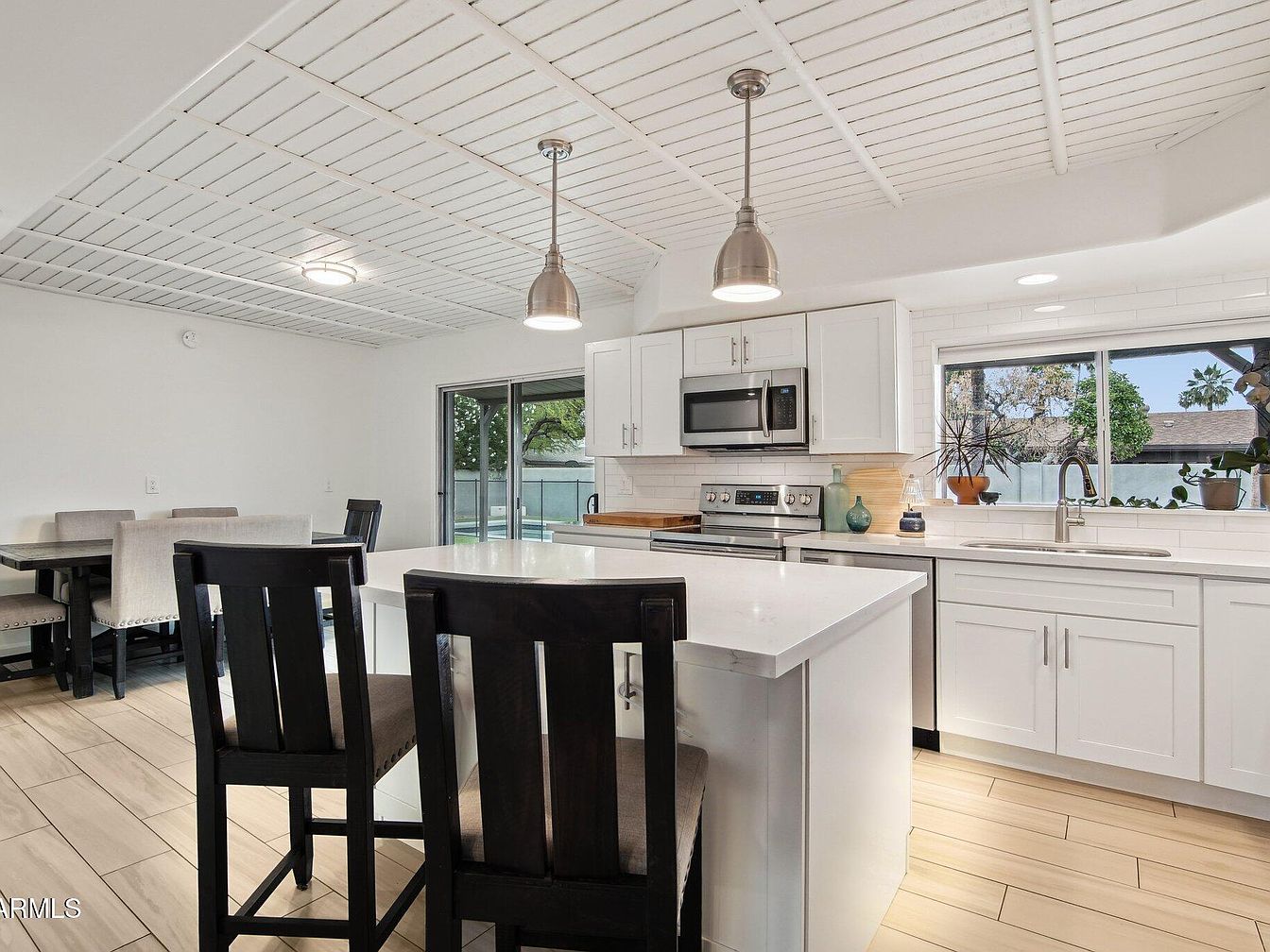 This bright, open kitchen features a clean, modern aesthetic with white cabinetry and countertops that create a fresh, airy feeling. Stainless steel appliances, including a microwave and stove, enhance the contemporary look. The ceiling is distinctively paneled with white slats and exposed beams, adding texture and architectural interest. Two pendant lights with metallic finishes hang above the central island, which provides additional counter space and seating with dark wood chairs upholstered in a neutral tone. Adjacent to the kitchen is a dining area with a rectangular dark wood table surrounded by beige cushioned chairs, all set on light wood-look tile flooring. Large windows and sliding glass doors offer views of greenery outside, flooding the space with natural light, reinforcing a welcoming atmosphere.