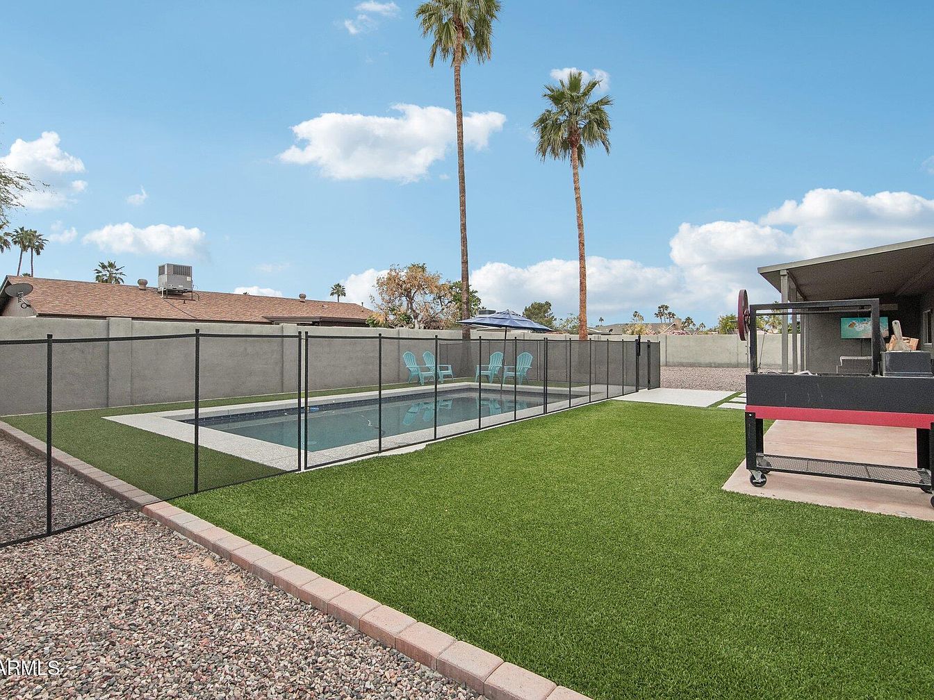 This backyard features a rectangular swimming pool enclosed by a sleek, black mesh safety fence, providing both security and unobstructed views. The pool is bordered by light concrete decking, contrasting with the vibrant green artificial turf that covers the surrounding lawn area. Two tall palm trees add a tropical ambiance, while a blue patio umbrella and matching turquoise Adirondack chairs create a relaxing seating spot on the far side of the pool. The yard incorporates minimal landscaping with rock beds and a paved grilling station for outdoor cooking, blending practicality with a clean, modern look.