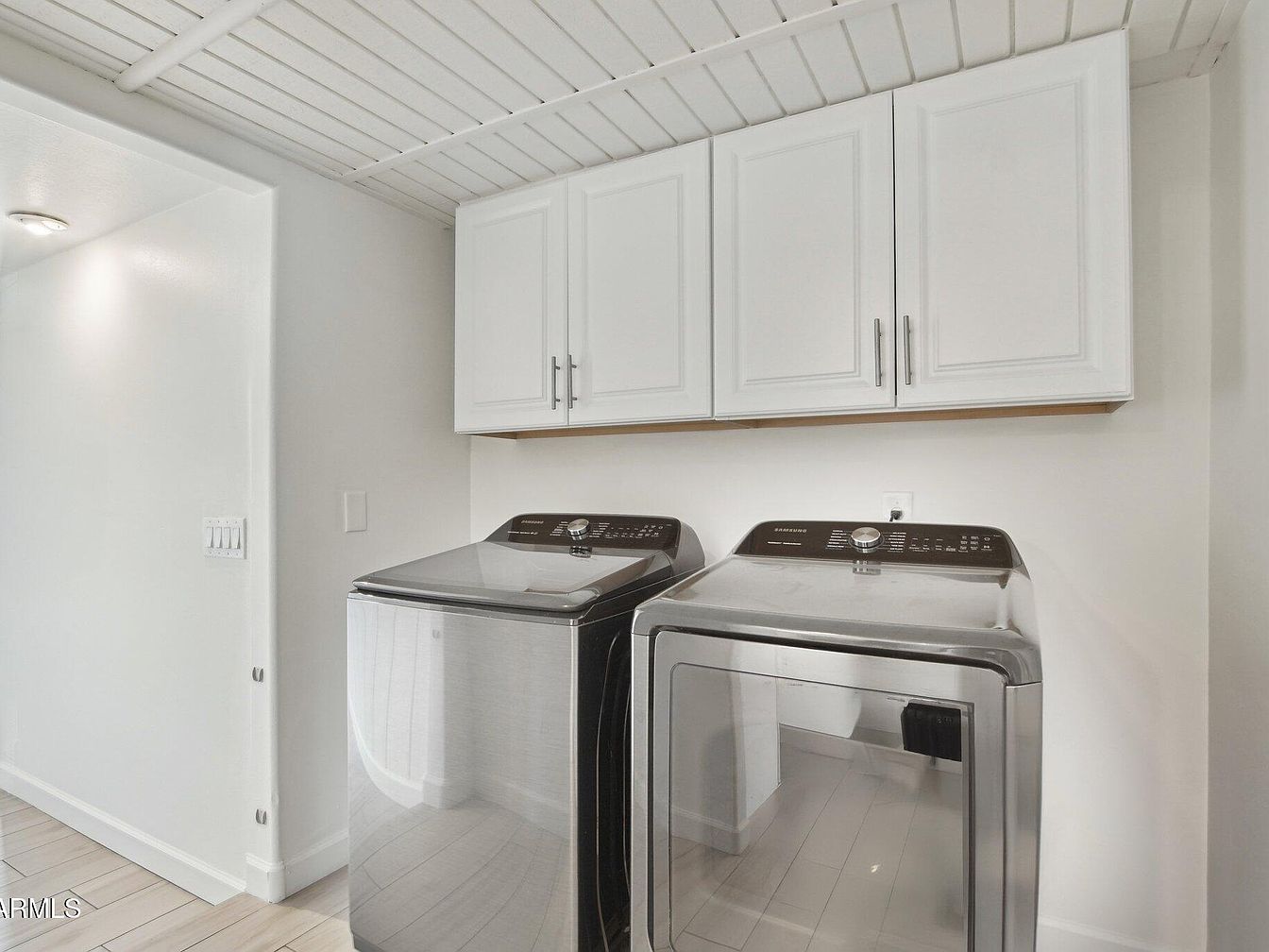 This laundry room showcases a clean, modern aesthetic with a focus on functionality. Featuring a pair of sleek, stainless steel Samsung washer and dryer units side by side, the space is designed for efficiency. Above the appliances, white cabinetry with simple, paneled doors and metallic handles provides practical storage while blending seamlessly with the white walls. The ceiling has a subtle grid pattern that adds texture, complementing the light wood-look tile flooring that extends into adjacent rooms. The overall neutral palette and minimalist elements create a bright, orderly environment ideal for household chores.