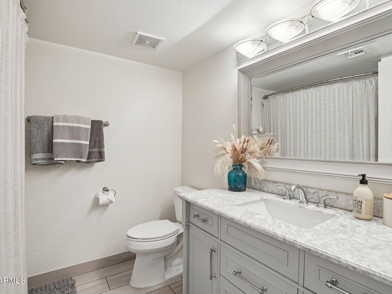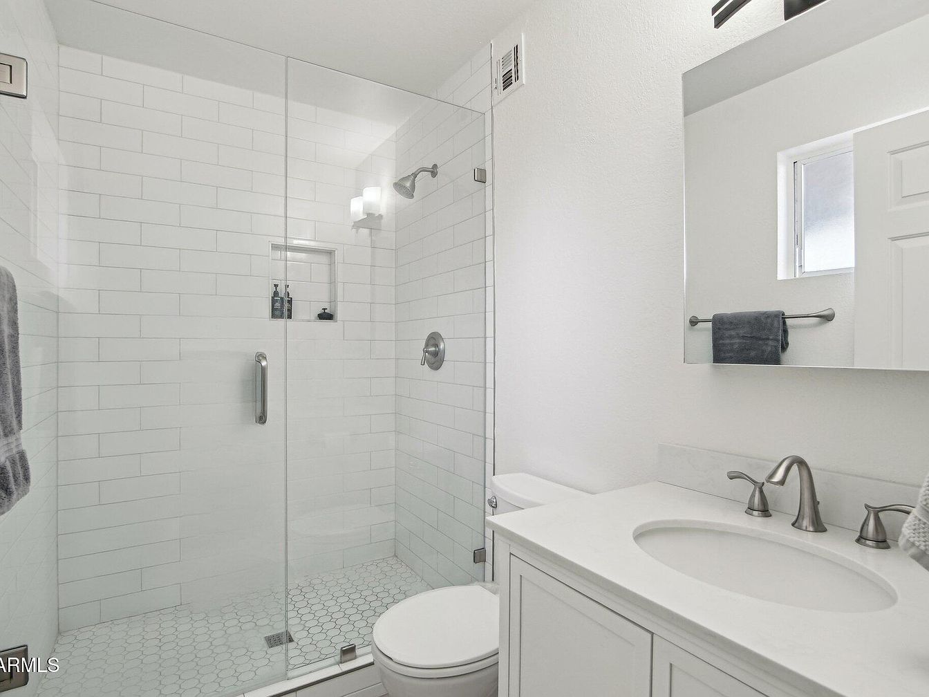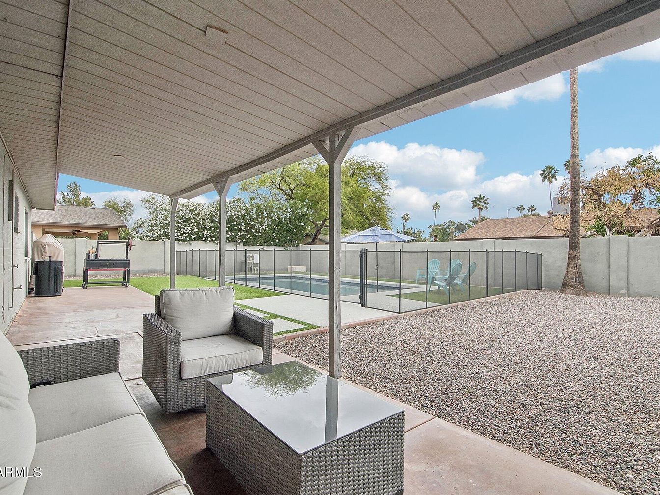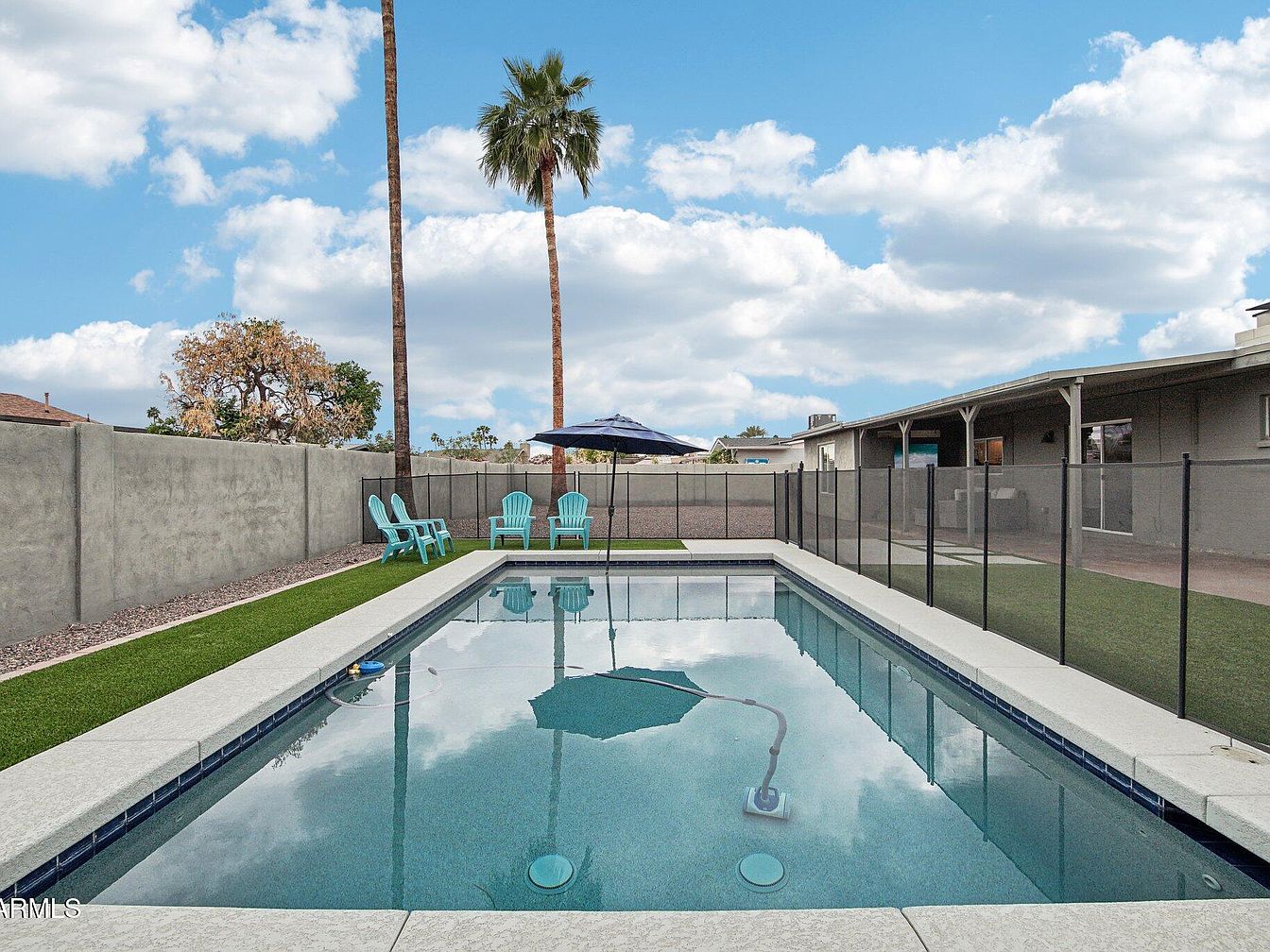 This rare 4-bedroom, 3-bath home in Scottsdale, AZ, exemplifies mid-century modern architectural style, featuring clean lines, flat roof sections, and a minimalist facade enhanced with neutral gray stucco. Situated on an oversized lot approaching nearly ¼ acre (approximately 10,890 sq ft), it offers ample outdoor space including a modern pool, new turf, and room to expand outdoor living areas. The home boasts a spacious open floor plan filled with natural light, complemented by porcelain tile flooring throughout, quartz countertops, soft-close shaker-style cabinets, stainless steel appliances, and a striking Carrara marble fireplace serving as a stunning centerpiece. Recent renovations include fresh interior paint, new Berber carpeting in the bedrooms, updated ceiling fans, and a remodeled primary bathroom. Additional updates to enhance comfort and convenience include a new HVAC system, an RV gate, and a recently resealed roof, providing added peace of mind. The versatile 4th bedroom includes its own private entrance and bathroom, making it ideal as a primary suite, guest quarters, office space, or VRBO rental opportunity. Offered at a listing price of $950,000, this home presents a unique opportunity in a prime, no-HOA Scottsdale neighborhood with great potential for both indoor and outdoor lifestyle enjoyment.