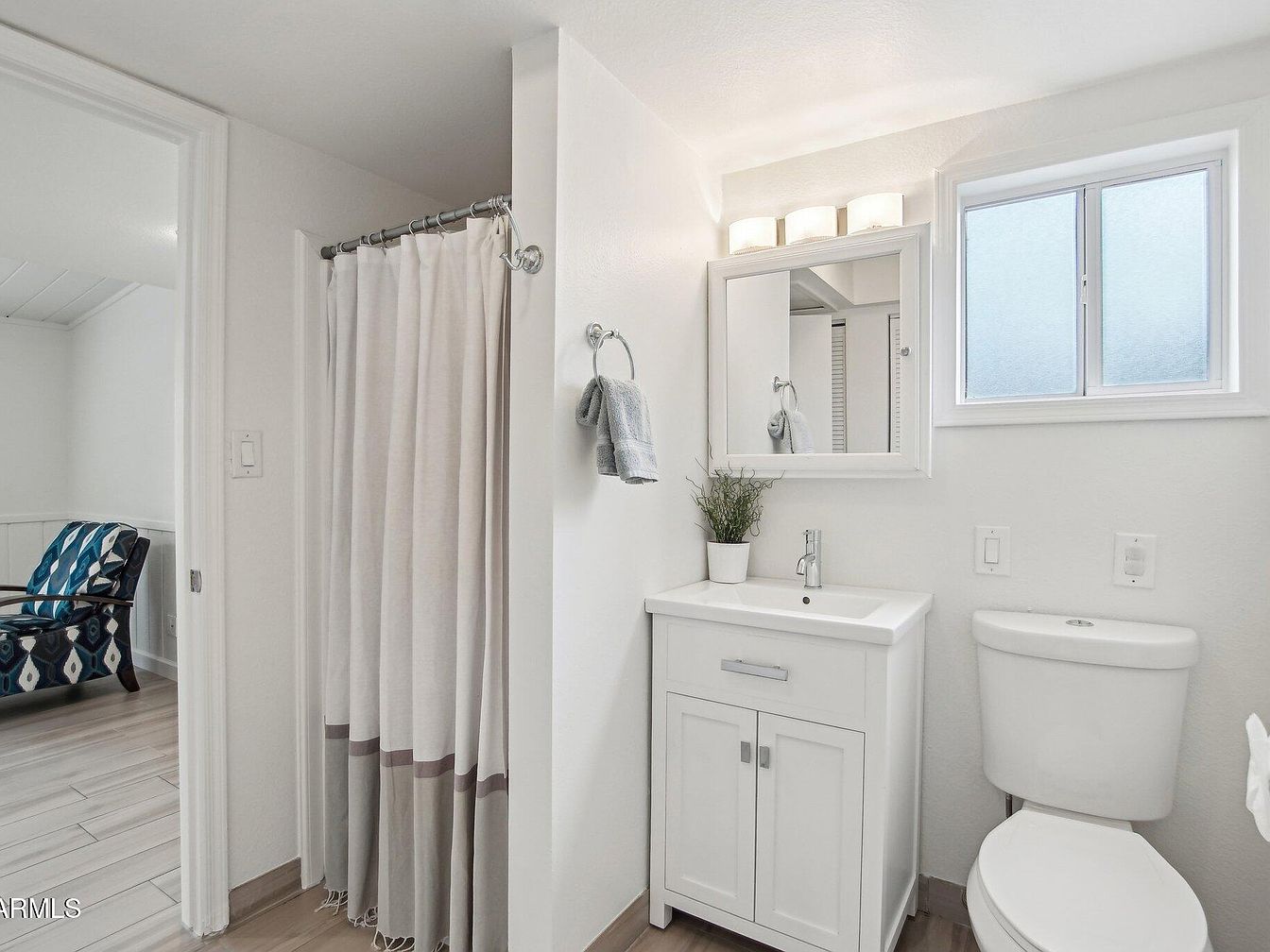 This compact bathroom features a clean, modern aesthetic with a predominantly white color scheme accentuated by neutral tones. The floor has light wood-like tiles that add warmth while maintaining brightness. A small white vanity with a sleek rectangular sink sits beneath a framed mirror, topped with three soft-glowing lights. To the right, a classic white toilet complements the space. A curtained shower area is tucked neatly beside the vanity, using a neutral beige and taupe curtain. A towel ring holding a gray hand towel adds subtle texture, and a small potted plant introduces a touch of greenery near the mirror. The frosted window allows natural light to softly illuminate the space, enhancing its fresh, minimalist design.