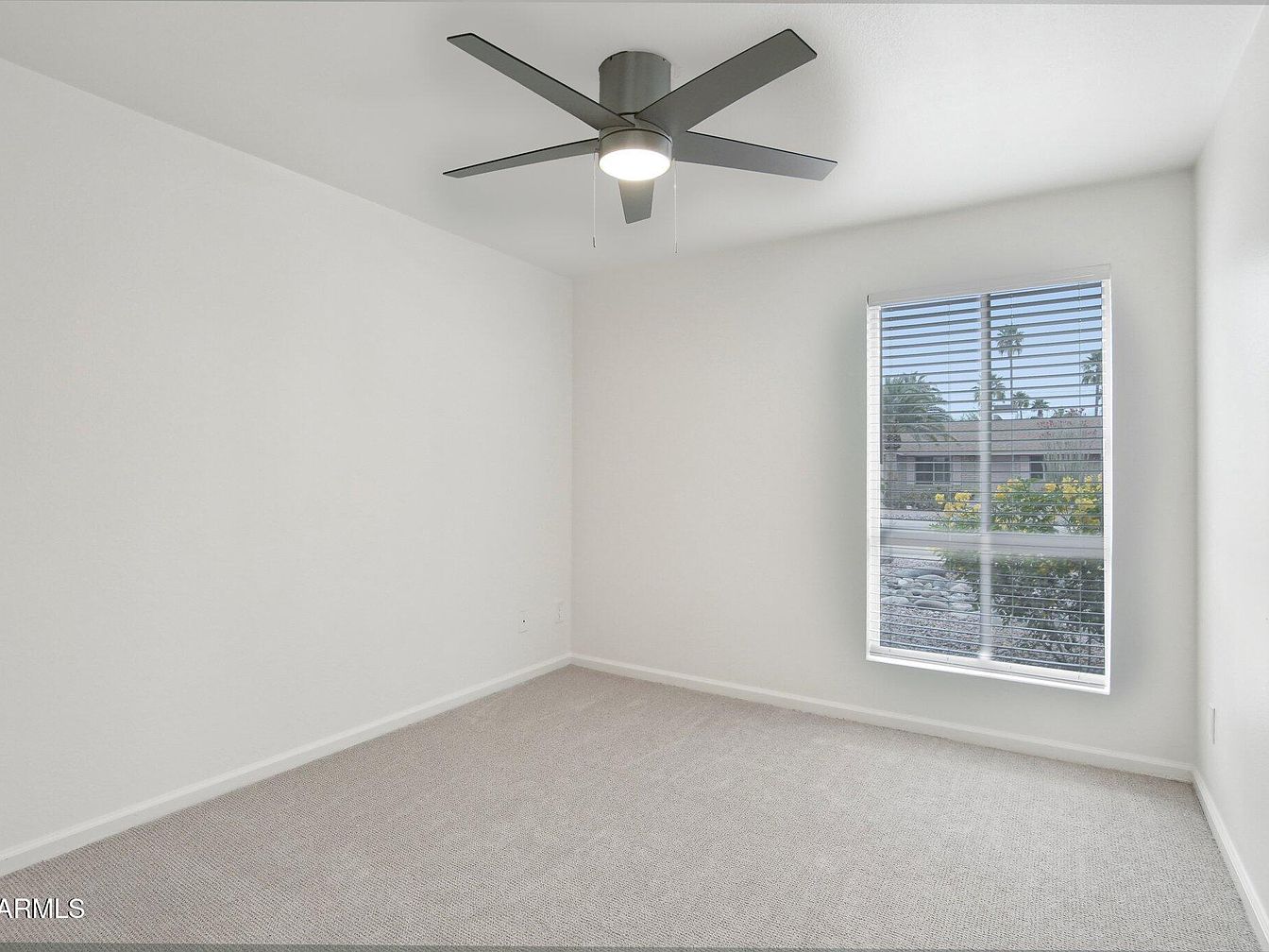 This bedroom corner features a fresh and airy ambiance created by soft white walls and light beige carpeting, enhancing the room’s brightness. A large window with horizontal blinds allows natural light to filter in while offering a view of greenery and palm trees outside, adding a touch of tranquility. The sleek modern ceiling fan with five blades and integrated light provides a stylish yet functional design element. The minimalist space invites personalization and promises a calm, comfortable retreat with its clean lines and neutral palette.
