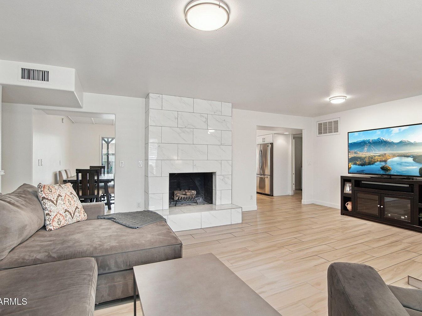 This spacious living room features a light, neutral color palette with beige wood-style flooring and white walls, creating a bright and airy atmosphere. A modern fireplace clad in large white marble-like tiles forms a striking focal point in the center of the room. Adjacent to the fireplace is a sectional sofa in a soft gray fabric, accented with patterned cushions in muted tones. On the opposite wall, a large flat-screen TV sits atop a dark wood entertainment unit, adding contrast. Open doorways lead to the dining area on one side and the kitchen with stainless steel appliances on the other, providing smooth flow throughout the home.