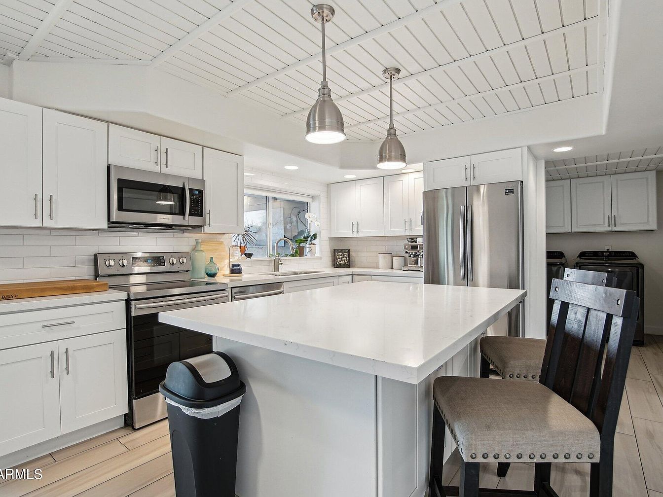 This kitchen features a spacious white island with a polished countertop, serving as a central hub for meal prep and casual dining, complemented by two dark wood chairs with upholstered seats. The cabinetry is painted white with sleek, simple hardware, harmonizing with the white subway tile backsplash that adds subtle texture. Stainless steel appliances, including a microwave, range, and large refrigerator, integrate seamlessly, enhancing the modern aesthetic. Above, two brushed metal pendant lights illuminate the space, while a ceiling with white paneling introduces architectural interest. Light wood flooring adds warmth, tying the clean, contemporary design together, with a laundry nook visible in the background.