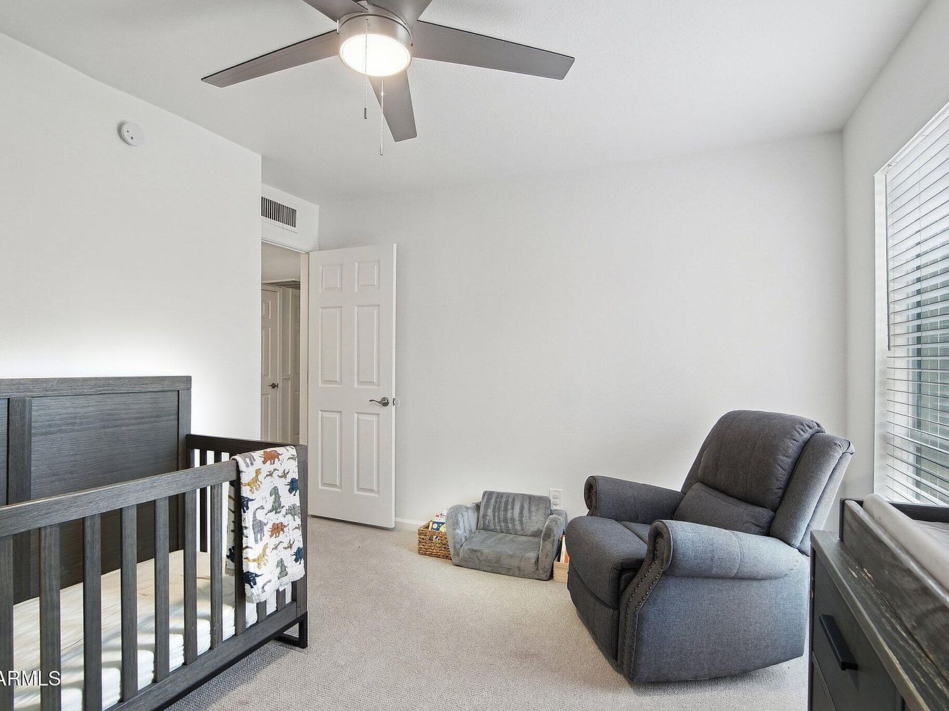 This nursery corner features a muted, neutral color palette dominated by soft grays and whites that create a calm, soothing atmosphere. A dark gray wooden crib with a playful dinosaur-themed blanket is positioned to the left, while a plush recliner and small cushioned chair sit near the bright window on the right, inviting quiet moments and comfort. The room has a clean, minimalist layout with light beige carpeting, white walls, and a ceiling fan with a light fixture that adds gentle illumination. The open door hints at connection to the rest of the home, emphasizing openness and simplicity in design.