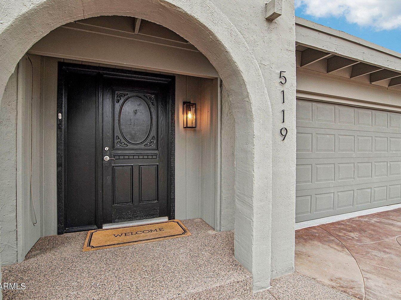 The front entryway is marked by a striking black door with intricate oval and rectangular panel detailing, framed by a soft grayish exterior wall. An arched stucco design surrounds the doorway, adding a sophisticated architectural element that contrasts with the textured concrete porch floor. To the right, the large garage door painted in a muted gray complements the house’s neutral and understated color palette. A warm, inviting wall sconce illuminates the entry area, paired with a simple “WELCOME” mat that offers a friendly touch. The house number “5119” is vertically aligned on the arch pillar, integrating functionality and style seamlessly.