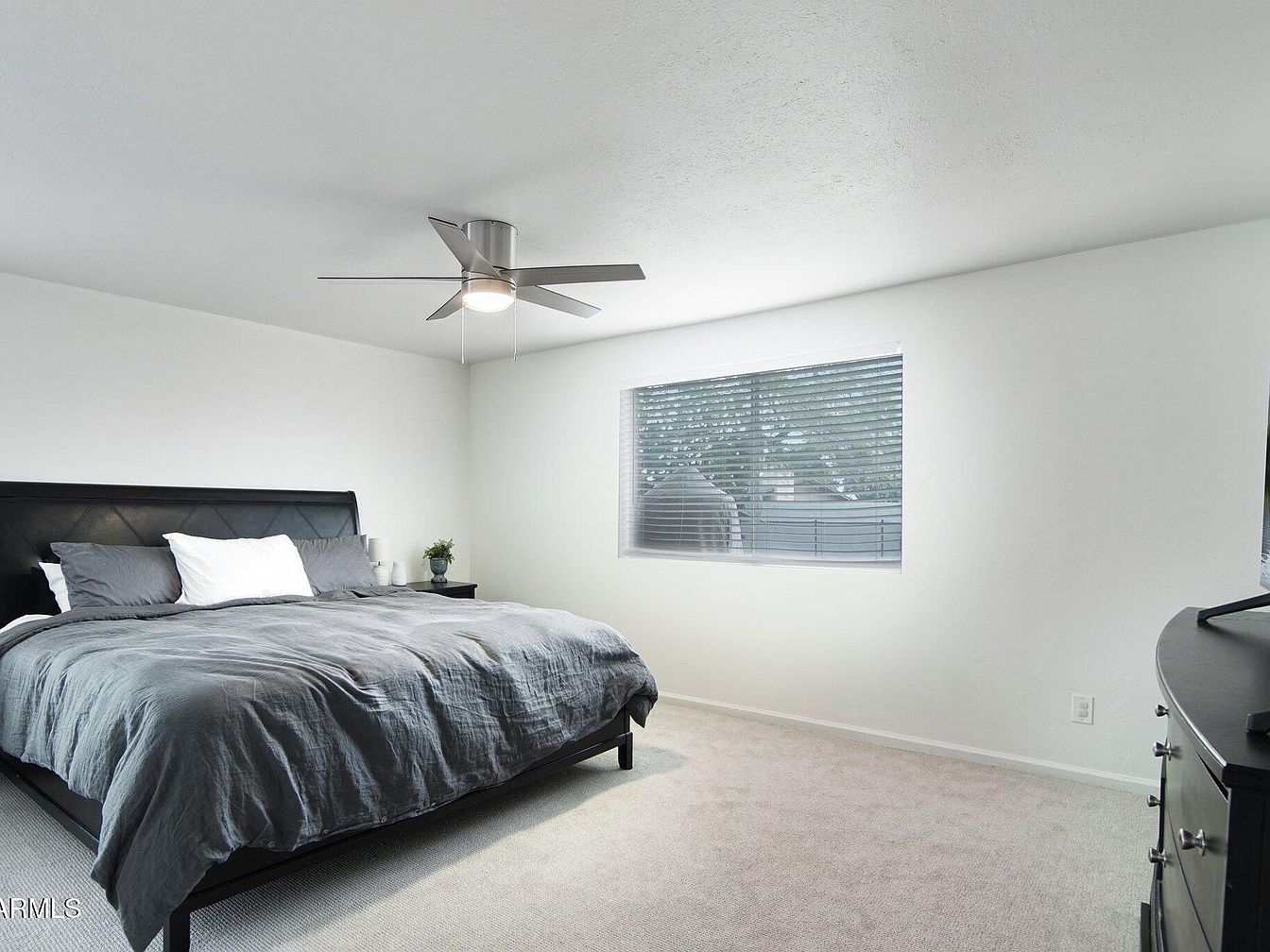 This master bedroom exudes a clean, minimalist vibe with soft neutral tones and simple furnishings. The walls are painted a crisp white, amplifying natural light from the medium-sized window fitted with horizontal blinds. A dark wood bed frame with a leather headboard anchors the space, outfitted with charcoal gray bedding and contrasting white pillows for subtle depth. A sleek, modern ceiling fan in brushed metal adds contemporary flair while providing functionality. Light beige carpet cushions the floor, enhancing the room’s cozy atmosphere. A dark dresser with silver handles is neatly positioned near the corner, complementing the bed’s dark finish.