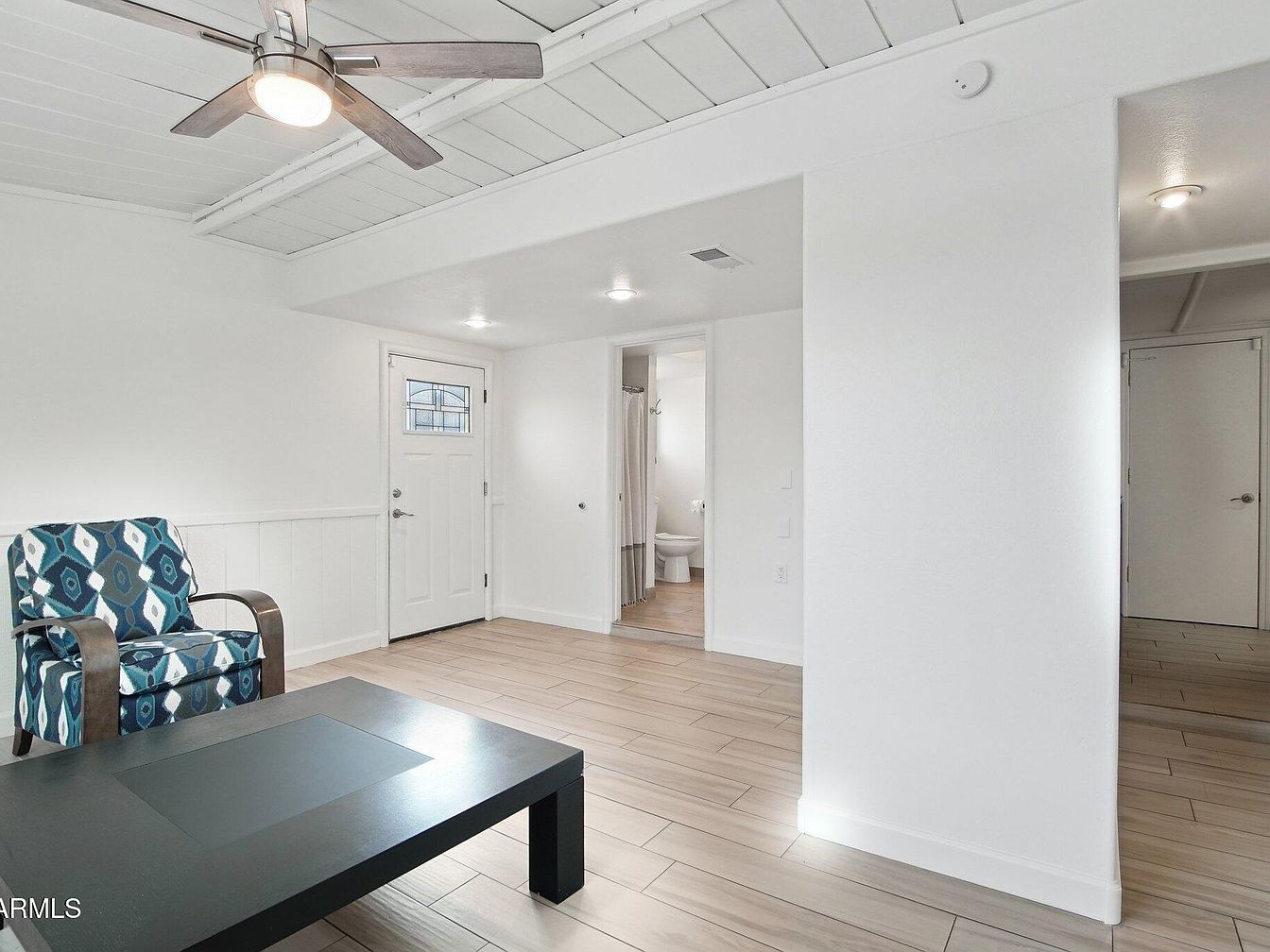 This welcoming entryway opens into a cozy sitting area accented by a bold patterned armchair featuring shades of blue and white with sleek curved wooden armrests. The room is bright and airy, characterized by white walls and ceiling panels that emphasize a clean, modern look. Light wood-look tile flooring adds warmth and texture to the space, complementing the minimalist black coffee table at the center. A ceiling fan with light provides practical illumination, while a white panel door with an inset window invites natural light inside. Beyond the entryway, a glimpse of a bathroom enhances the practical layout of the home.