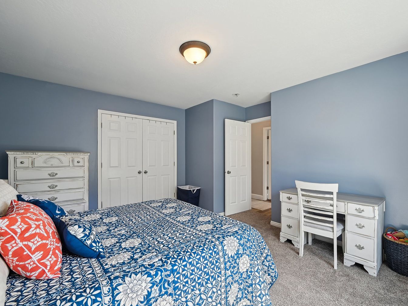 This bedroom features a calming blue-gray palette with matching walls and a soft grey carpet that enhances comfort. A large bed dressed in a blue and white patterned quilt is accented by vibrant coral and blue throw pillows, adding a pop of color to the soothing tones. The white furniture, including a vintage-style dresser and a matching desk with a chair, offers both function and charm. Two white doors—one for closet space and one leading to another room—contrast crisply against the blue walls. The ceiling light fixture provides warm, ambient illumination, completing this serene and inviting space.