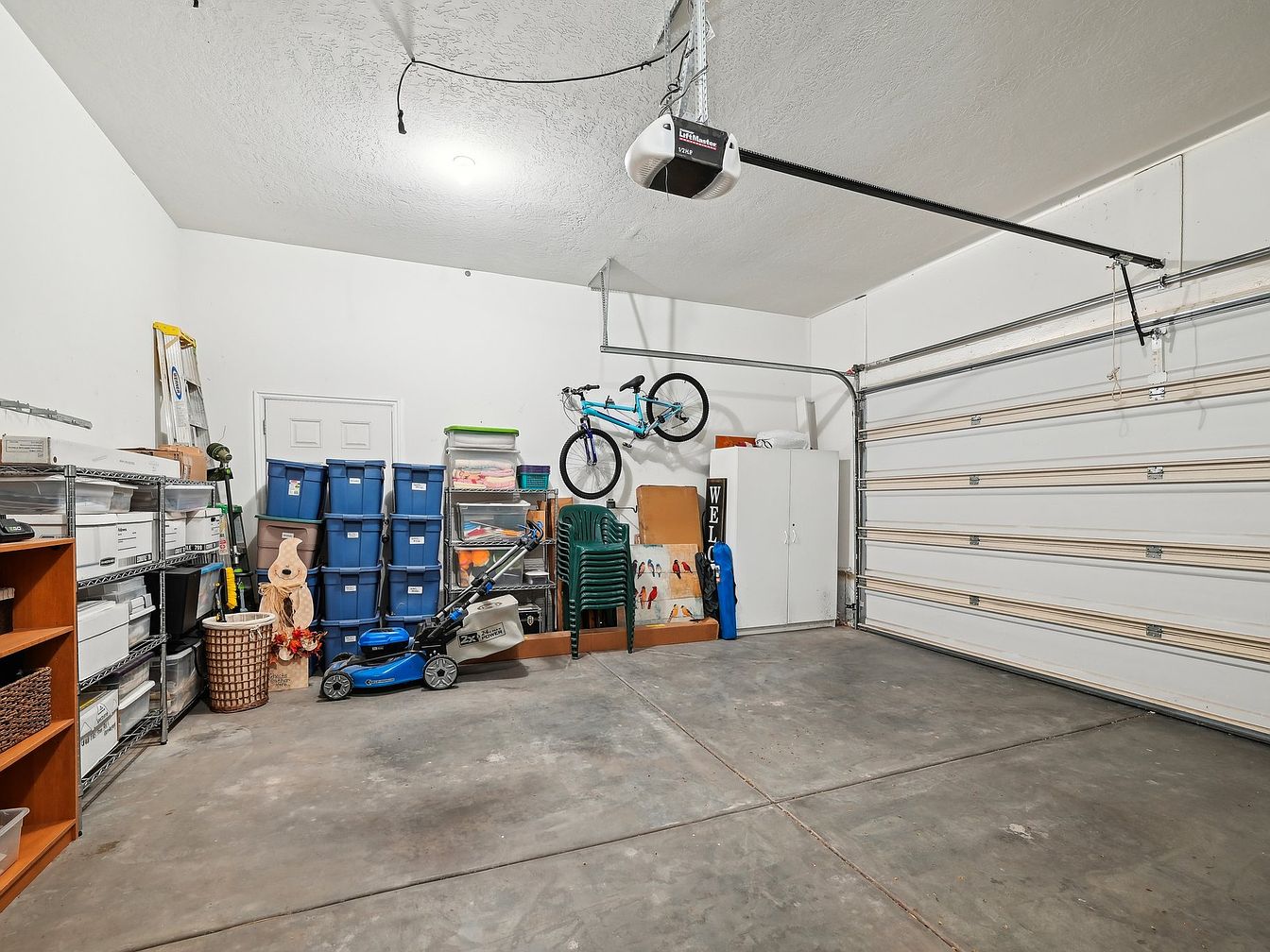 This spacious garage features a clean, utilitarian design with a concrete floor and white walls, creating a bright and functional space. A large white sectional garage door dominates one wall, while the opposite side is lined with various shelving units housing storage bins and organized household items. A notable feature includes a mounted blue bicycle, maximizing vertical space efficiently. Additional items like stacked plastic chairs, a lawn mower, and a white storage cabinet indicate practical use for both storage and home maintenance. The overall aesthetic is practical and orderly, emphasizing utility and accessibility.