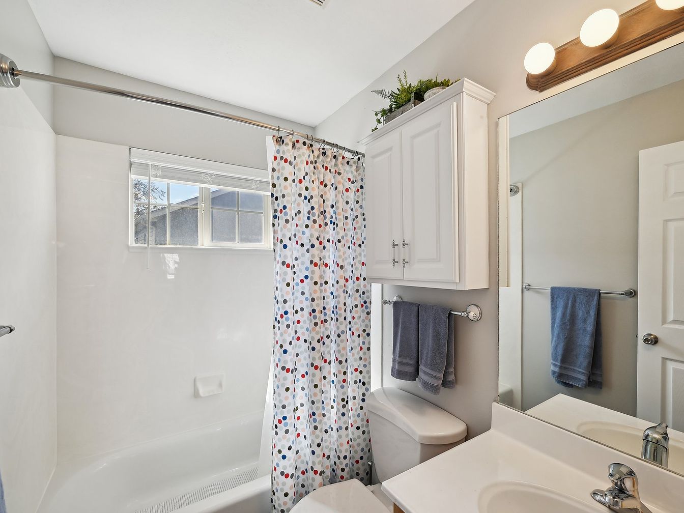 This compact bathroom integrates a clean, functional design with light neutral colors enhancing brightness and space. The white bathtub and surrounding walls create a sleek, minimalistic backdrop. A frosted window above the tub allows natural light to flow in while maintaining privacy. A shower curtain with playful multicolored polka dots adds a vibrant, casual touch to the subdued palette. Above the toilet, a white cabinet with silver hardware provides practical storage, topped with small greenery for a refreshing accent. Two blue-gray towels hang neatly on a polished chrome bar, complementing the simple, airy ambiance.