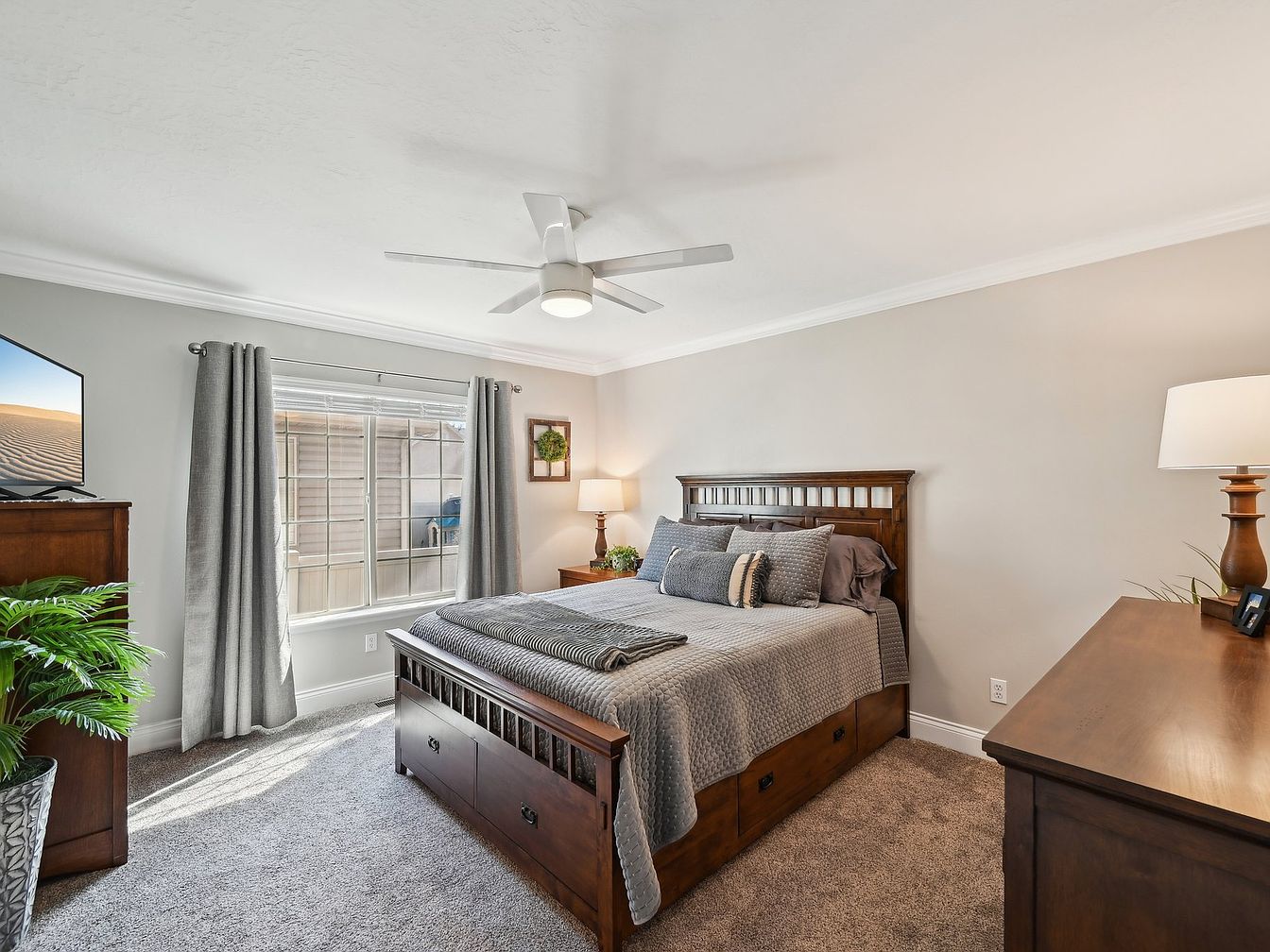 This master bedroom features a warm and inviting atmosphere with neutral beige walls and a textured carpet floor in soft gray tones. The wooden bed frame with built-in storage drawers showcases a classic design, matched by a similarly styled wooden dresser and nightstand. The bed is neatly dressed in a textured gray quilt and multiple accent pillows, enhancing the cozy feel. Natural light pours in through a large window framed by light gray curtains, creating a bright and airy space. Modern touches include a sleek ceiling fan and simple decorative elements such as a framed green wreath and table lamps with warm wood bases.