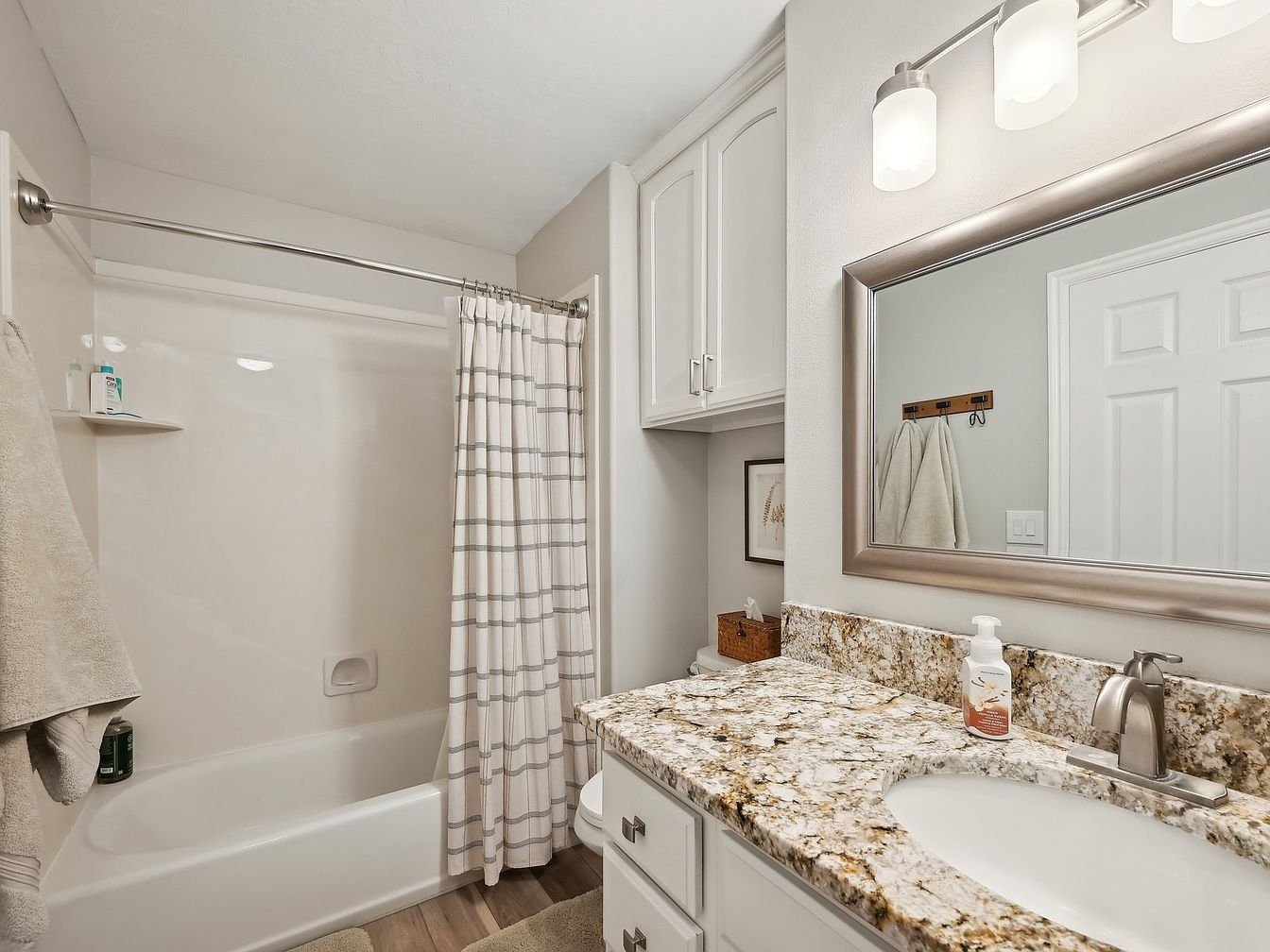 This bathroom features a compact, efficient layout with a combination bathtub and shower encased in a smooth, light-colored wall surround. A plaid shower curtain adds subtle pattern without overwhelming the space. The vanity countertop is striking with its granite surface boasting a mix of cream, beige, and brown tones, complemented by white cabinetry adorned with simple square knobs. Above the sink, a large rectangular mirror framed in brushed metal reflects bright lighting provided by three translucent, cylindrical fixtures. The light walls and wood-look flooring create a warm, inviting atmosphere while maintaining clean, modern aesthetics.