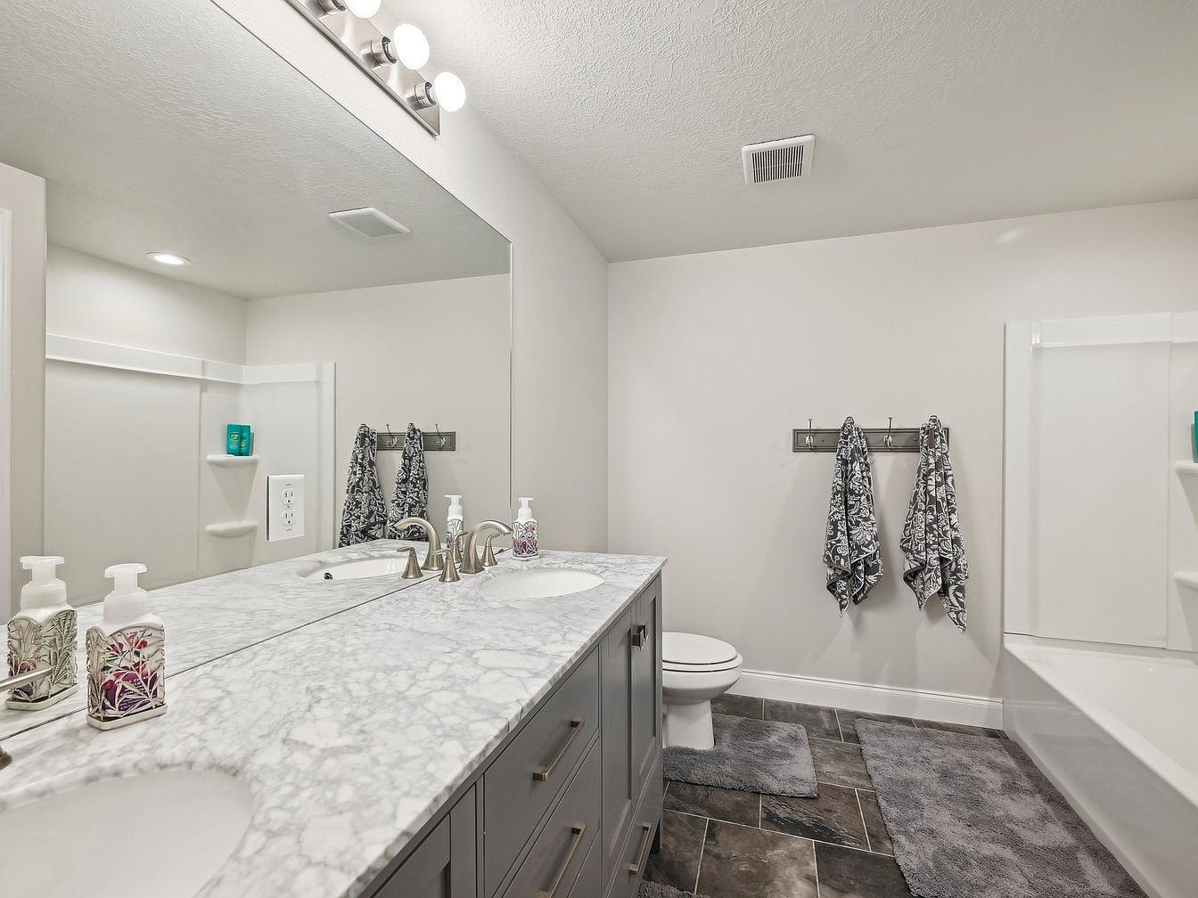 This bathroom features a modern double-sink vanity with a polished marble countertop that adds elegance and lightness to the space. The cabinetry is painted a soft gray, complementing the sleek silver hardware and brushed nickel faucets. The expansive mirror above the vanity enhances the sense of openness and reflects ample lighting from the contemporary fixtures overhead. Along the right side, a bathtub with a clean white surround sits adjacent to a wall with multiple hooks holding patterned dark gray towels. Dark slate floor tiles contrast the lighter walls and provide durability. Plush gray rugs soften the floor, creating a cozy and functional environment.