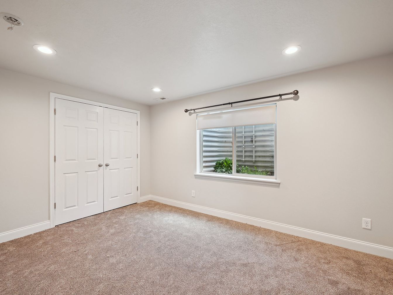 This cozy basement bedroom features soft beige carpeting that complements the neutral, light cream walls, creating a calm and inviting atmosphere. The room is illuminated by recessed ceiling lights, enhancing the bright and clean aesthetic. A large window with a metal security well outside provides natural light despite the below-ground location, fitted with a simple roller shade for privacy. The double white paneled closet doors add a classic touch while maximizing storage space. White baseboards and door trim frame the room neatly, emphasizing its fresh, modern simplicity and functionality.