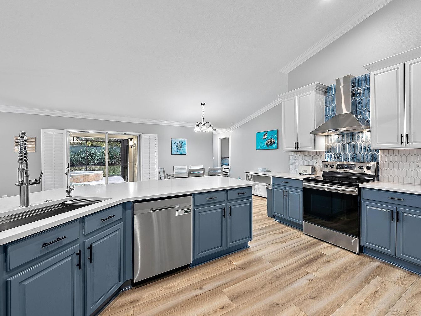 This kitchen features a spacious, open layout with a large peninsula that includes an undermount sink and stainless steel dishwasher. The cabinetry is painted a muted blue, offering a bold contrast against bright white quartz countertops and white upper cabinets. The backsplash combines white hexagonal tiles with a vertical arrangement of blue elongated hex tiles behind the range, anchoring the cooking area with a splash of color. Light wood-look flooring runs throughout, complementing the cool tones of the cabinetry. Beyond the kitchen is a dining area with a simple dining table and chairs, illuminated by a classic chandelier, overlooking a sliding glass door that leads to an outdoor space.