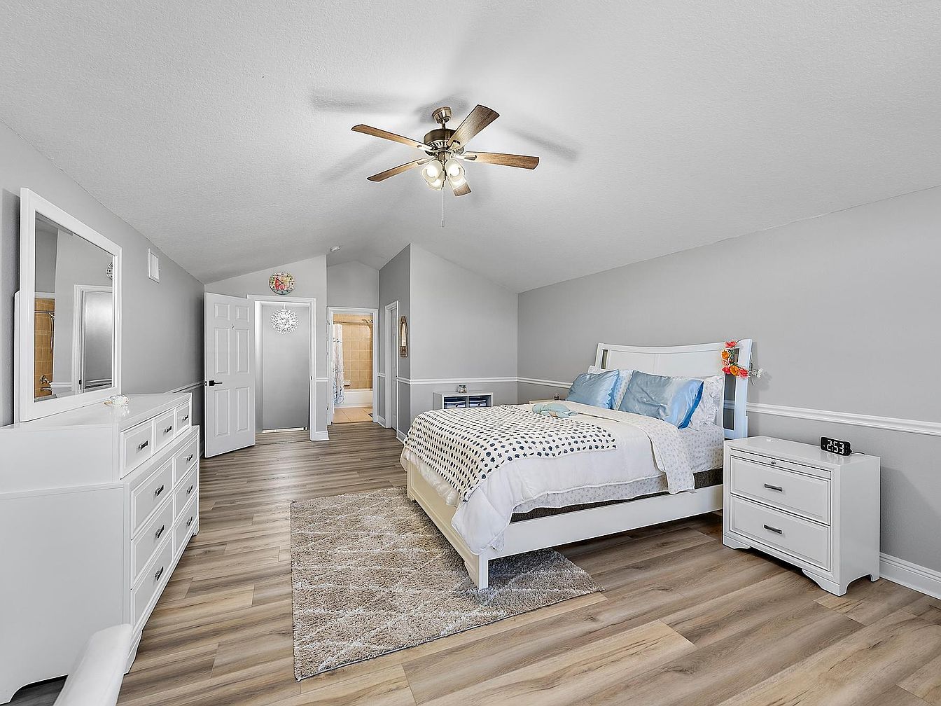 This spacious master bedroom exudes a peaceful, modern charm with its soft gray walls contrasted by crisp white trim and furniture. The wood-look laminate floors add warmth while maintaining a clean aesthetic. A large white bed with pastel blue pillows anchors the room next to a matching nightstand, adorned with a digital alarm clock. A cozy beige rug adds texture underfoot. The ceiling fan, centered on the vaulted ceiling, combines wood blades with soft lighting. Opposite the bed, a white dresser with a large mirror enhances light and space. Through the open doorway, a glimpse into an adjacent bathroom highlights the room’s functional layout.