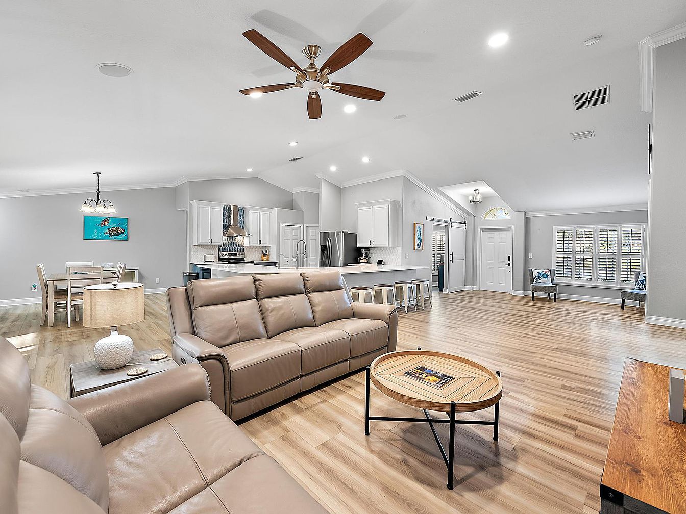 This expansive, open-concept space combines the living room, kitchen, and dining area seamlessly, emphasizing a modern and airy atmosphere. The flooring features light wood tones that add warmth and continuity throughout. Neutral beige leather sofas offer comfortable seating focused around a round wooden coffee table with metal legs, introducing a subtle industrial flair. The kitchen boasts white cabinetry, a large island with bar stools, and stainless steel appliances, contributing to a bright and clean aesthetic. Recessed lighting and a ceiling fan with wooden blades enhance the functionality and style, while soft gray walls and crisp white trim provide a sophisticated backdrop. A window nook with shuttered windows and accent chairs adds charm near the front door area.