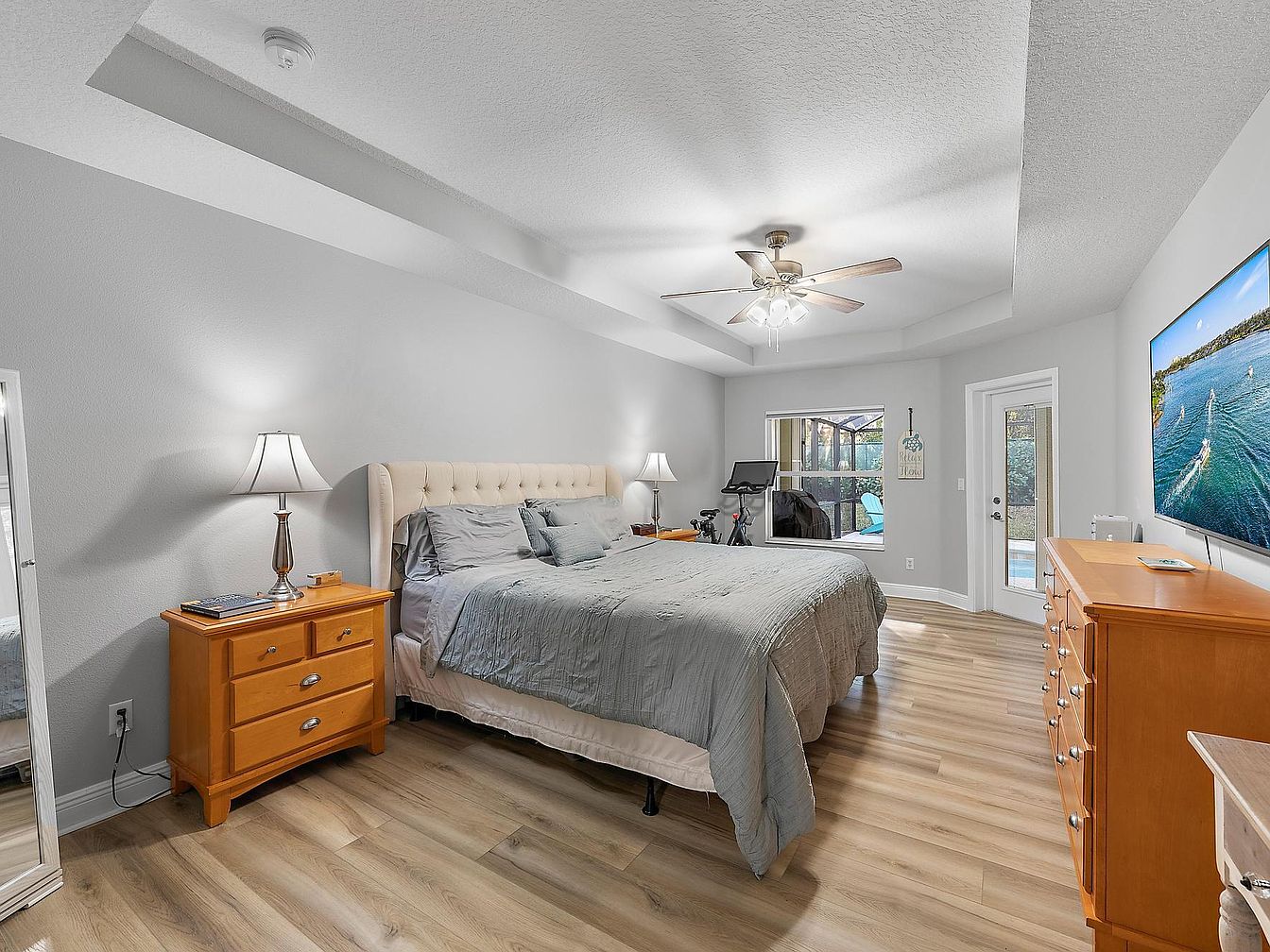 This spacious master bedroom features soft, neutral tones with light gray walls that complement the light wood flooring, creating a calm and inviting atmosphere. The upholstered bed with tufted headboard is centrally placed, flanked by matching wooden nightstands with lamps adding warm ambient light. A ceiling fan with light fixtures provides both illumination and air circulation. A large dresser with multiple drawers stands opposite the bed, beneath a mounted flat-screen TV. Natural light enters through a window and a glass door leading to an outdoor sitting area, enhancing the airy, open feel. An exercise bike sits next to the window, adding a practical touch to the room’s design.