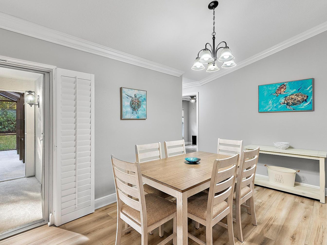 This serene dining space features a light wood table surrounded by six matching chairs with woven seat cushions, creating a warm, inviting atmosphere. Soft gray walls contrast gently with white crown molding and baseboards, enhancing the room’s clean, modern look. A classic chandelier with frosted glass shades hangs centered above the table, providing balanced illumination. Coastal artwork featuring sea turtles in vibrant turquoise hues adds a splash of color and personality. A simple white console table under one painting holds a decorative white bowl and a metal container labeled “Cold Drinks.” A sliding glass door with plantation shutters leads to an outdoor area with natural light flooding the space, emphasizing its airy and fresh aesthetic.