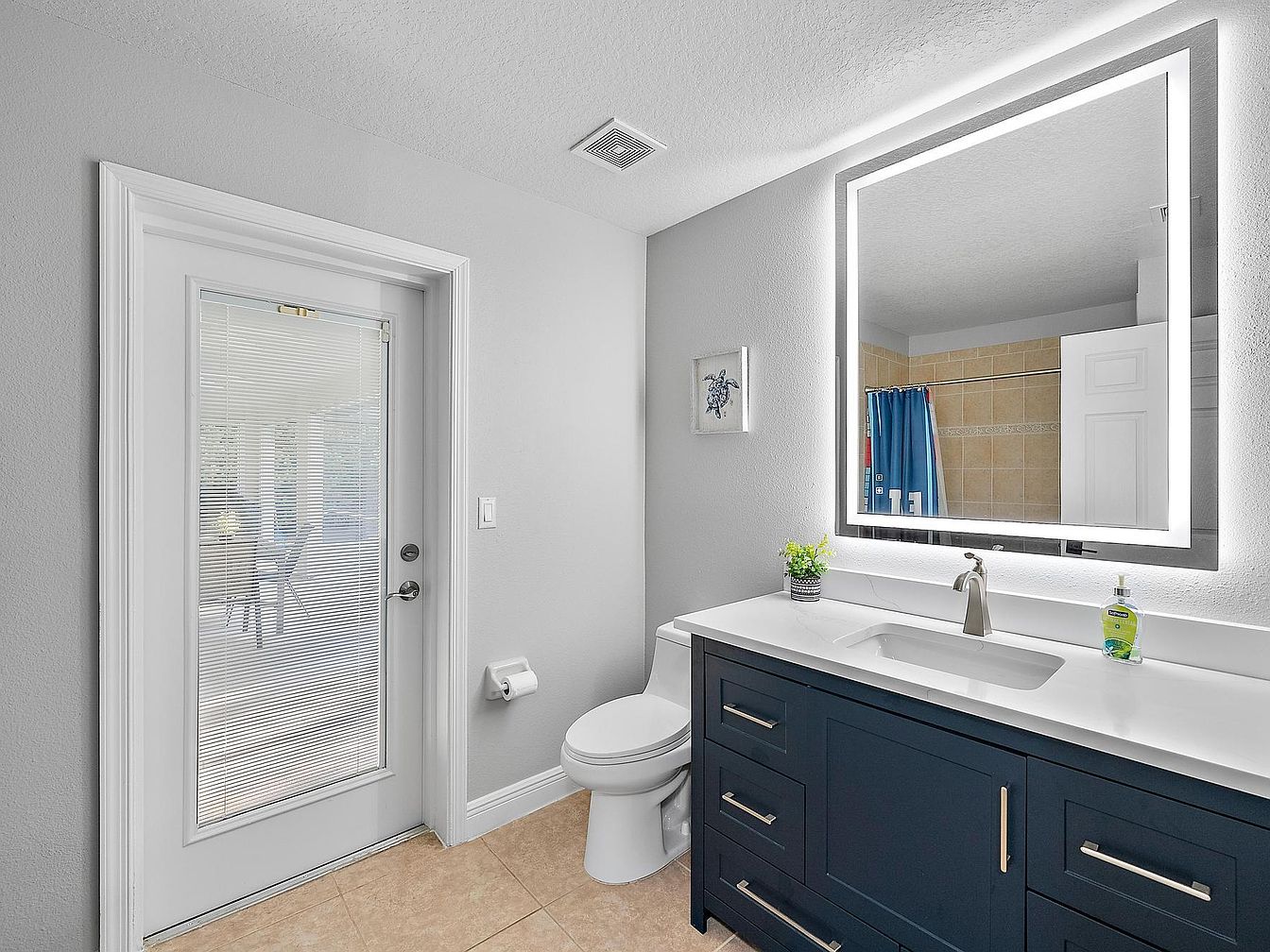 This bathroom features a sleek and modern design with a minimalist aesthetic. The walls are painted a soft, neutral gray that complements the beige tile flooring. A contemporary vanity in a deep navy blue tone anchors the space, topped with a smooth white countertop that houses an undermount sink with a brushed nickel faucet. Above the vanity is a large, rectangular mirror framed with integrated LED lighting, providing bright and even illumination. A white toilet is positioned against the wall, adjacent to a door with built-in blinds for privacy and natural light control. Subtle décor, such as a small potted plant and framed artwork, adds a touch of personality and warmth to the space.