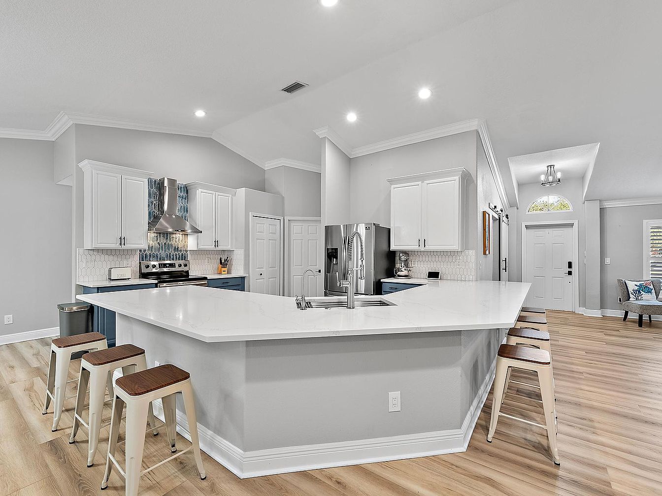 This open kitchen features a large, angular white quartz countertop peninsula that doubles as seating with five modern metal stools with wooden tops. The kitchen’s color palette blends soft gray walls, white upper cabinets, and deep blue lower cabinetry, complemented by honey-toned wood plank flooring. A stainless steel stove and matching hood sit against a white hex tile backsplash with a vertical dark blue mosaic accent behind the range. Recessed lighting brightens the space, while a stainless steel refrigerator and double pantry doors add practical storage. The layout flows into the entryway, visible through an open arch, enhancing the light and airy feel.
