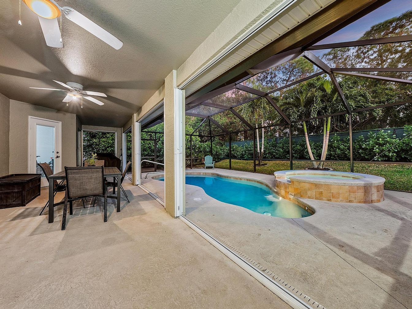 This outdoor living space features a spacious, covered patio seamlessly connected to a screened-in pool area, creating an inviting year-round retreat. The patio’s neutral beige flooring and light taupe walls complement the natural greenery visible beyond the black-framed pool enclosure, enhancing the tranquil atmosphere. Equipped with a black metal dining table and four matching mesh chairs, the area is perfect for casual meals or gatherings. Ceiling fans overhead provide comfort during warm days. The pool itself boasts a gentle curve with an attached spa clad in soft earth-toned tile, bordered by lush landscaping and tall palm trees for privacy and a tropical vibe.