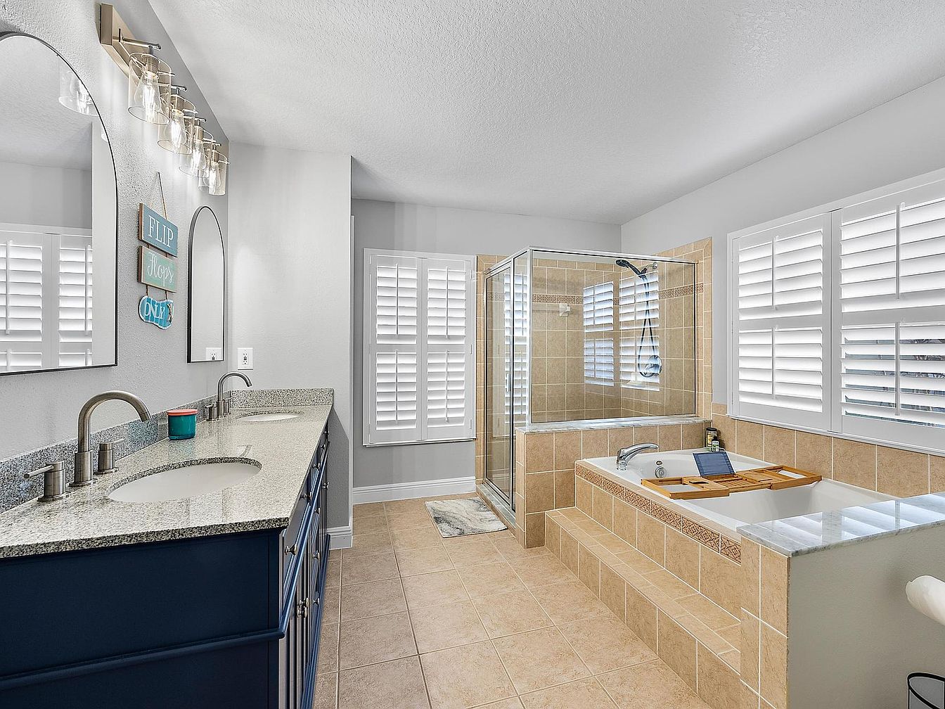 This spacious master bathroom boasts a clean, light color palette dominated by soft grays on the walls and warm beige tiles covering the floor, shower, and bathtub surrounds. The room is designed with functionality and comfort in mind, featuring a large glass-enclosed shower with a modern showerhead and built-in niche. Adjacent to it is a sunken bathtub with steps leading up, enhanced by a wooden bath caddy perfect for relaxing. Opposite these wet areas is a double vanity with a speckled granite countertop, sleek brushed-nickel faucets, and navy-blue cabinetry, paired with two large arched mirrors. Bright white plantation shutters on two windows offer privacy while allowing natural light to flood the space.
