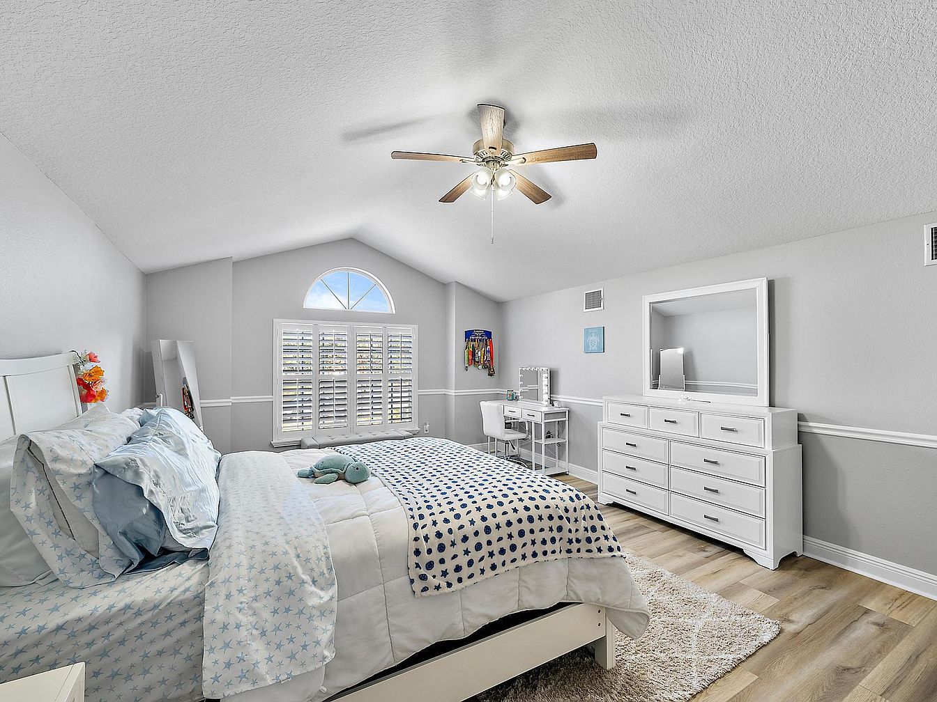 This master bedroom features a calming neutral palette with light gray walls complemented by white wainscoting and trim, enhancing the room’s crisp, clean aesthetic. The vaulted ceiling draws the eye upward, adding spaciousness, and is centered by a ceiling fan with wooden blades and integrated light fixtures. A large, arched window with white plantation shutters floods the room with natural light while providing privacy. The white furniture—an inviting bed with star-patterned bedding, a wide dresser with a matching framed mirror, and a vanity desk paired with a comfortable chair—creates a cohesive and airy ambiance. Warm wood-look flooring and a plush area rug add softness and texture to the space, making it both stylish and cozy.