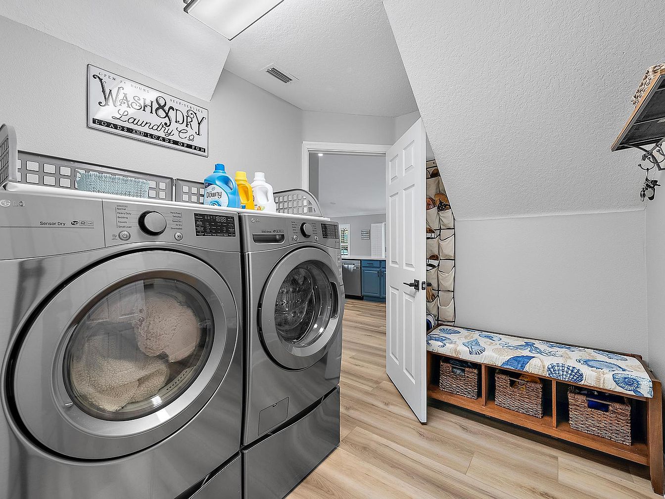 This cozy laundry space features sleek stainless steel front-loading washer and dryer units paired with a light grey wall color that keeps the room feeling fresh and airy. The light wood-look flooring adds warmth and continuity with the adjoining room visible through a partially open white door. A decorative “Wash & Dry Laundry Co.” sign enhances the charming, functional vibe of the room. On one side, a wooden bench with seashell-patterned cushion and woven basket storage underneath offers a comfortable spot to sit or organize laundry essentials, adding a coastal touch to the practical layout.