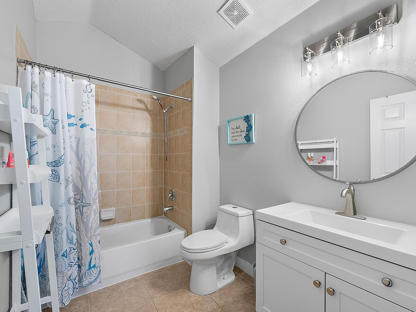 This bathroom combines functionality with a clean, modern design. The tub and shower area is enclosed by a stainless steel curtain rod holding a white shower curtain adorned with light blue sea-themed patterns, complementing the oceanic decor theme referenced by wall art. The walls are painted a soft gray, paired with large beige floor tiles and tan ceramic tiles lining the shower area, accented with a decorative horizontal tile strip. A sleek white toilet and matching vanity with a rectangular sink provide ample storage. Above the vanity is a large round mirror with a contemporary triple-bulb light fixture, enhancing the room’s bright and airy atmosphere.