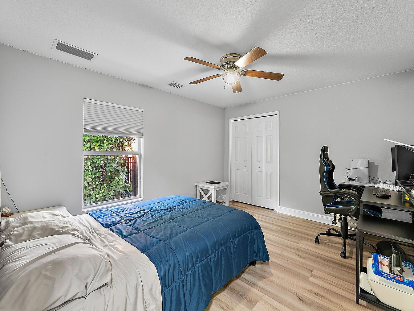 This serene bedroom features a minimalist design with light gray walls that create a calm ambiance. A comfortable bed dressed in a blue comforter and neutral-toned sheets anchors the left side of the room, positioned beneath a window partially covered with a white blind, allowing natural light and greenery views. Opposite the bed, a compact black desk holds a gaming-style chair, dual monitors, and a white gaming console, balancing leisure and productivity. The light wood flooring adds warmth, while a white side table and a ceiling fan with wooden blades enhance functionality and comfort in this well-organized, modern retreat.