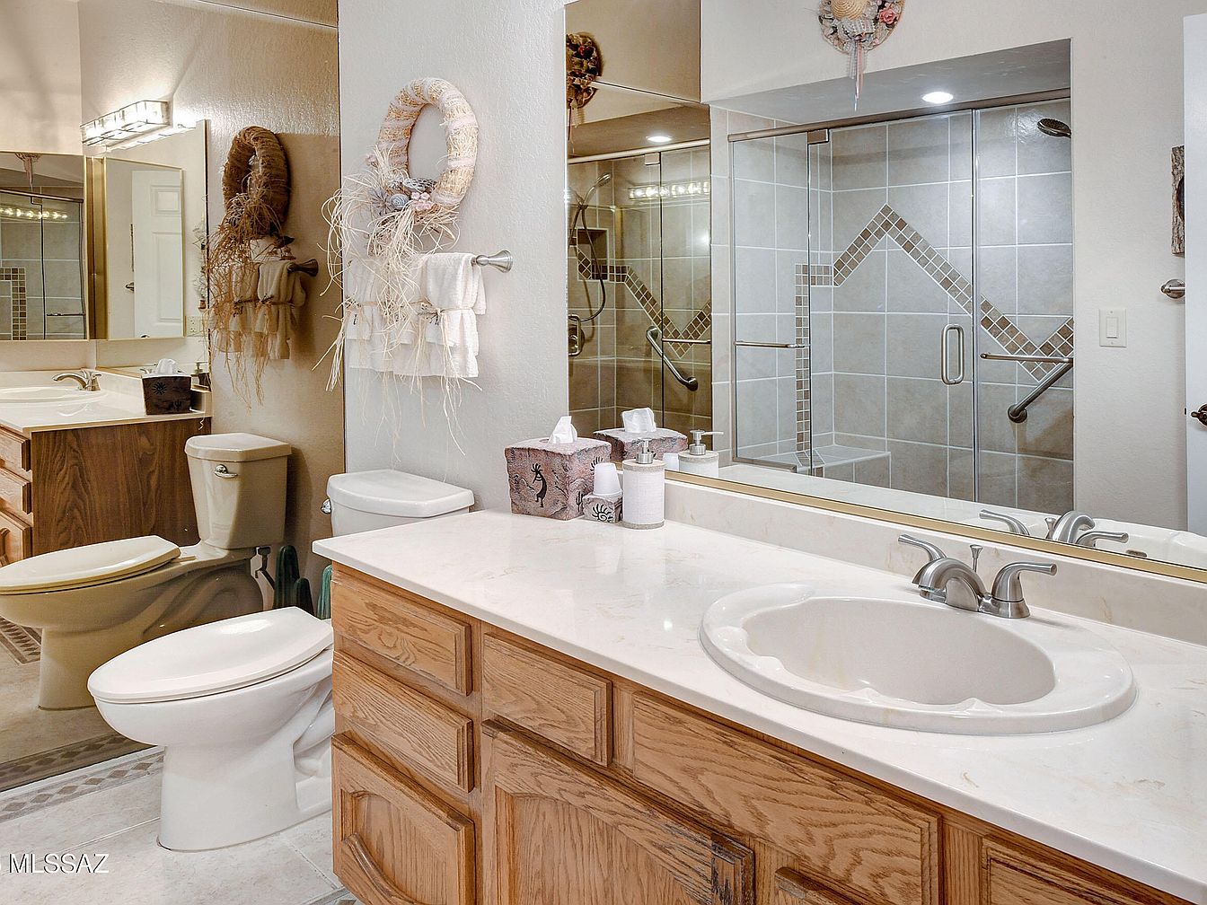 This bathroom features a spacious single-sink vanity with a light beige countertop and natural oak cabinetry, providing ample storage. A large mirror spans the wall above the sink, enhancing the sense of openness. The decor includes neutral tones with light, creamy walls complementing the wooden cabinetry. A decorative wreath and neatly hung white towels add a cozy, rustic charm. The bathtub is enclosed with clear glass sliding doors showcasing detailed tile work with geometric patterns in beige and brown hues. Chrome fixtures and lighting add a modern touch to this warm, inviting space.