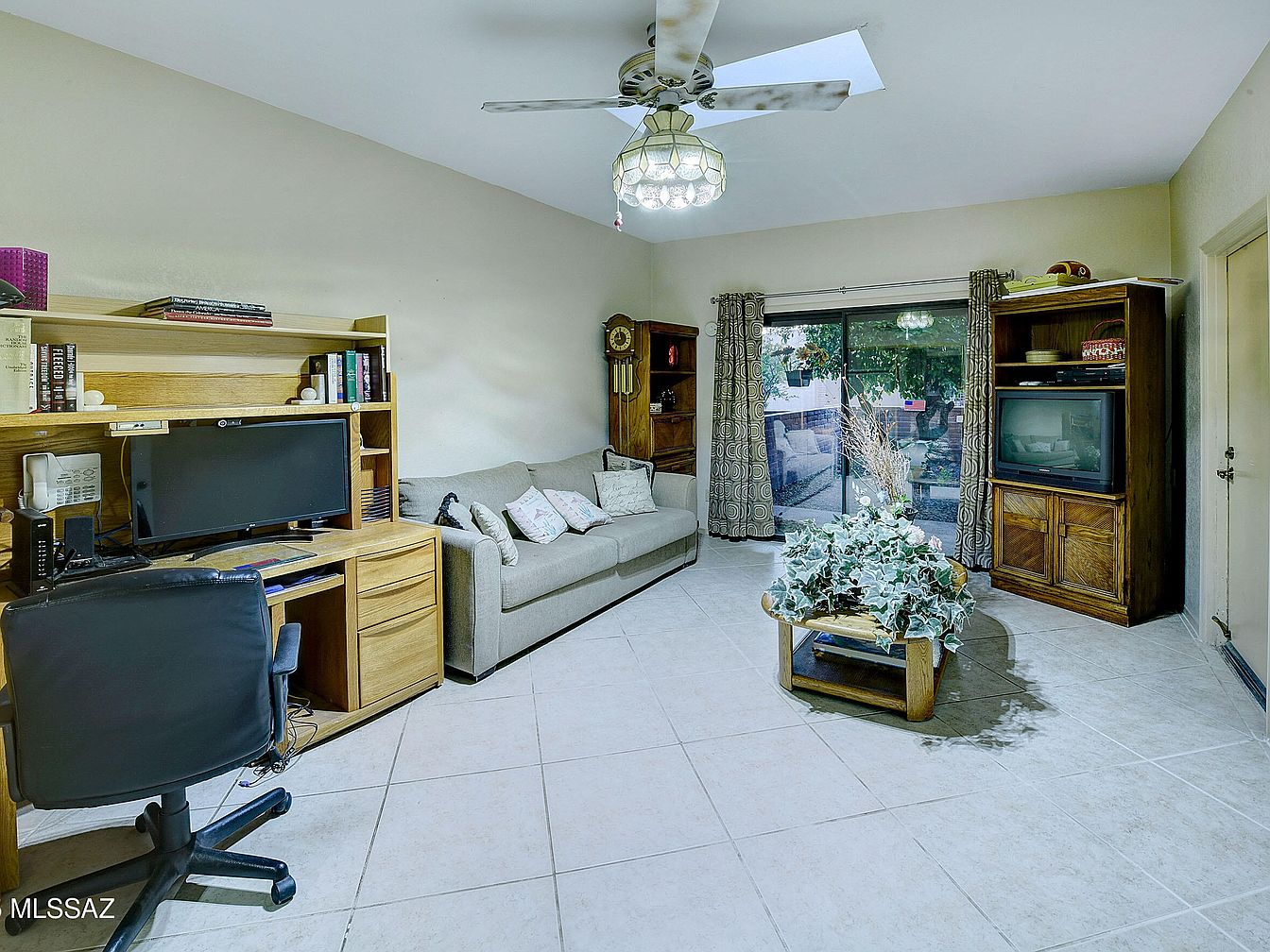 This space blends a home office and family area, featuring light beige walls and large, off-white ceramic tile flooring that enhances brightness. A wooden computer desk with shelving holds a monitor and books, paired with a black swivel office chair. Adjacent is a gray upholstered sofa adorned with decorative pillows. Two substantial wooden cabinets flank a tv area, offering storage and display space with vintage charm. Sliding glass doors with patterned curtains open to an outdoor patio, bringing natural light and garden views. A ceiling fan with an ornate light fixture provides airflow while adding character to the high ceiling.