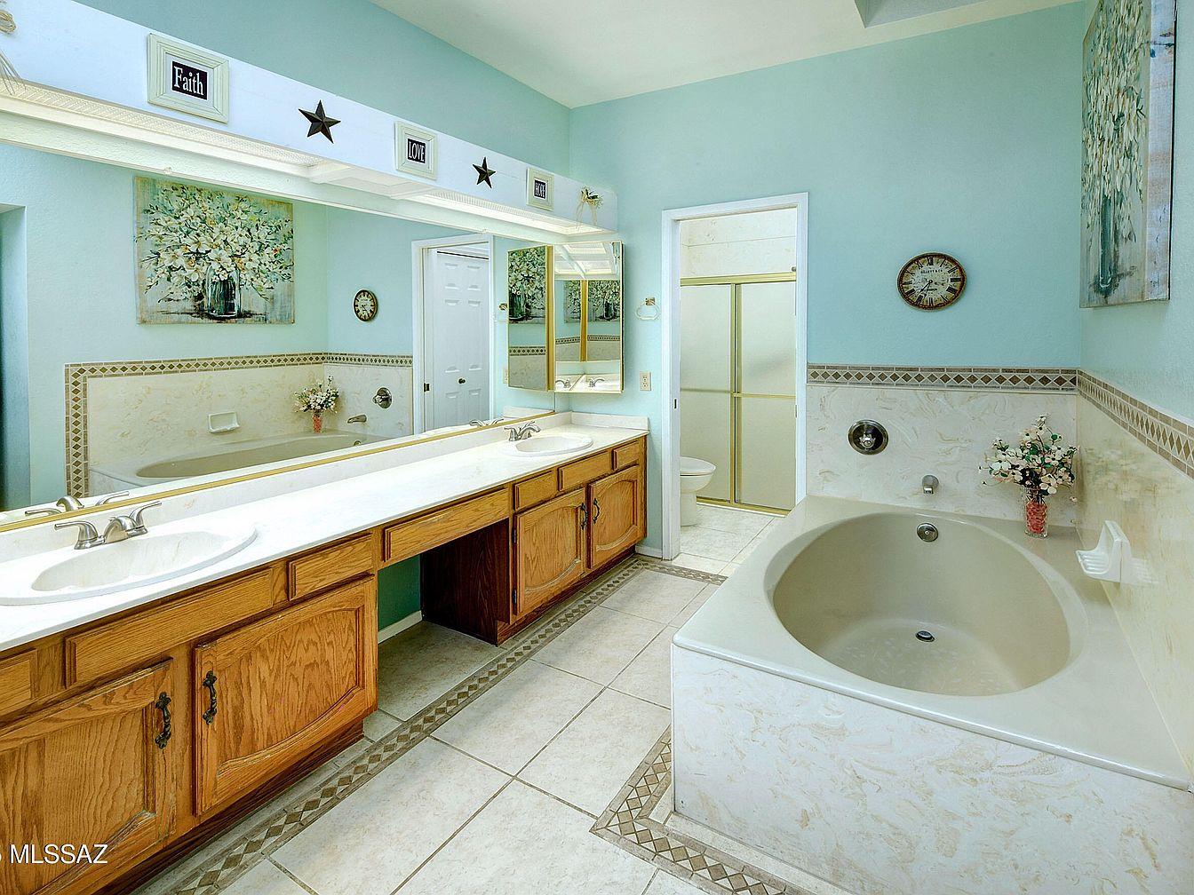 This master bathroom showcases a serene and spacious design highlighted by soft pastel blue walls that create a calming atmosphere. The large vanity features a double sink with a long white countertop resting on warm oak cabinetry, providing ample storage and workspace. The bathtub, surrounded by cream-colored marble tiles with a subtle beige pattern and bordered by diamond mosaic trim, invites relaxation. A large mirror spans the wall above the vanity, reflecting the soothing color palette. Decorative elements like floral artwork, a round wall clock, and inspirational framed words add a personalized, homey touch to the room.
