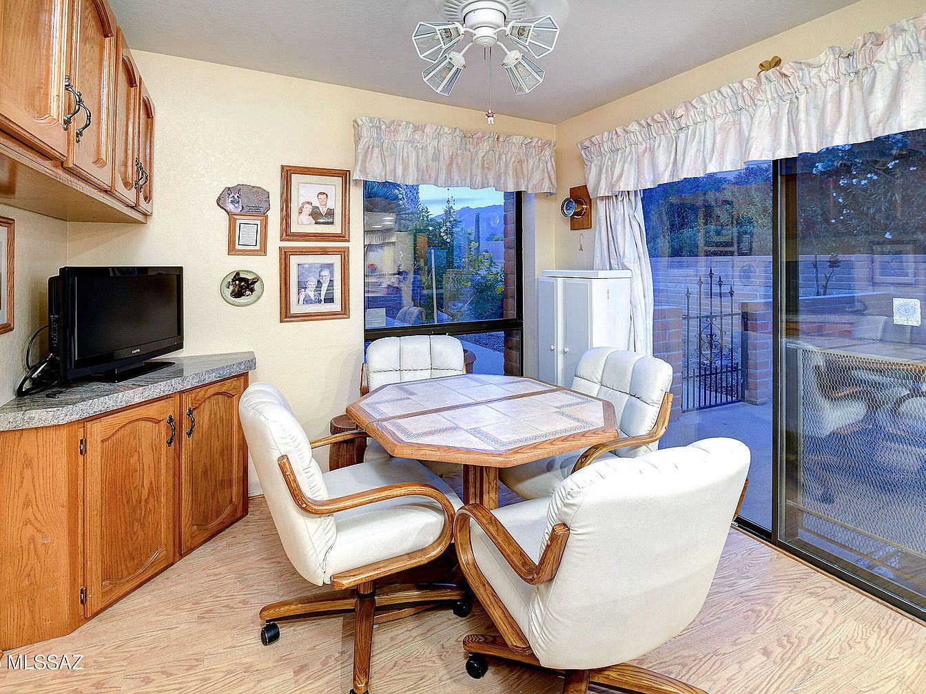 This cozy breakfast nook is defined by its warm wood tones and comfortable seating. A wooden octagonal table with a tiled center anchors the space, surrounded by four cushioned chairs upholstered in soft white leather with wooden framework and rolling casters. The walls are painted a soft cream, complementing the honey oak cabinetry with ornate black handles along one side. Two large windows provide natural light and views of a garden area beyond a wrought iron gate. Above the windows, delicate ruffled valances in cream add a gentle, traditional touch. A ceiling fan with multiple lights ensures comfort and illumination.