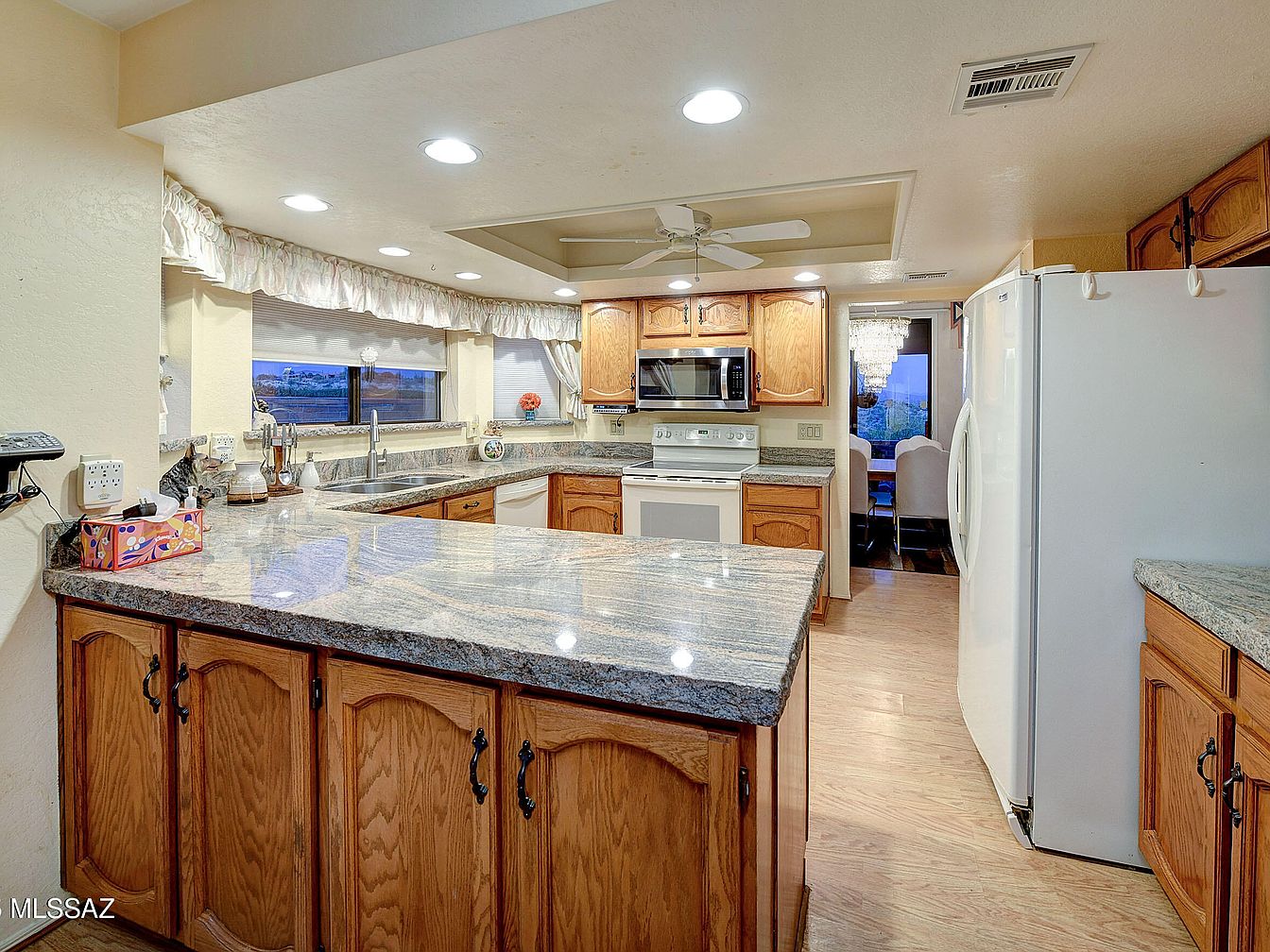 This warm and inviting kitchen features a U-shaped layout with a prominent granite countertop island that doubles as a workspace and breakfast bar. Natural oak cabinetry with traditional paneling and dark hardware offers ample storage and contrasts nicely with the light granite surfaces. The flooring complements the cabinetry in a light wood tone, contributing to the cohesive look. Recessed ceiling lights evenly illuminate the space, while a white ceiling fan is installed centrally in a recessed ceiling area for added airflow. White appliances, including a refrigerator, stove, and microwave, maintain a clean, classic feel. A window above the double sink floods the room with natural light, framed by soft, ruffled curtains, while the adjacent dining area is subtly visible through a doorway, accented by a crystal chandelier.