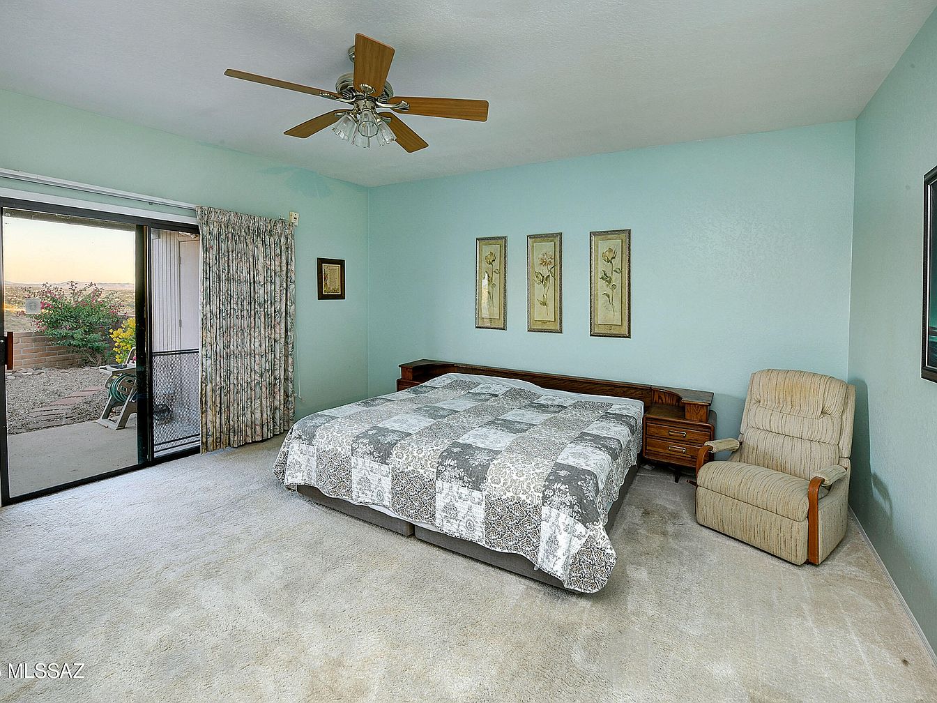 This bedroom features soft, pastel blue walls that create a calming and serene atmosphere. The spacious layout includes a large bed covered in a patchwork-style quilt in various shades of gray and white, complemented by a dark wood headboard with built-in nightstands on either side. On the right-hand side, a comfortable beige cushioned recliner adds a cozy seating option. A classic ceiling fan with five wooden blades and glass light fixtures hangs centrally from the ceiling. Floor-to-ceiling sliding glass doors allow access to an outdoor patio and bring in ample natural light, brightening the neutral-toned carpeting and enhancing the room’s airy feel. Floral artwork above the bed adds a touch of nature-inspired elegance.